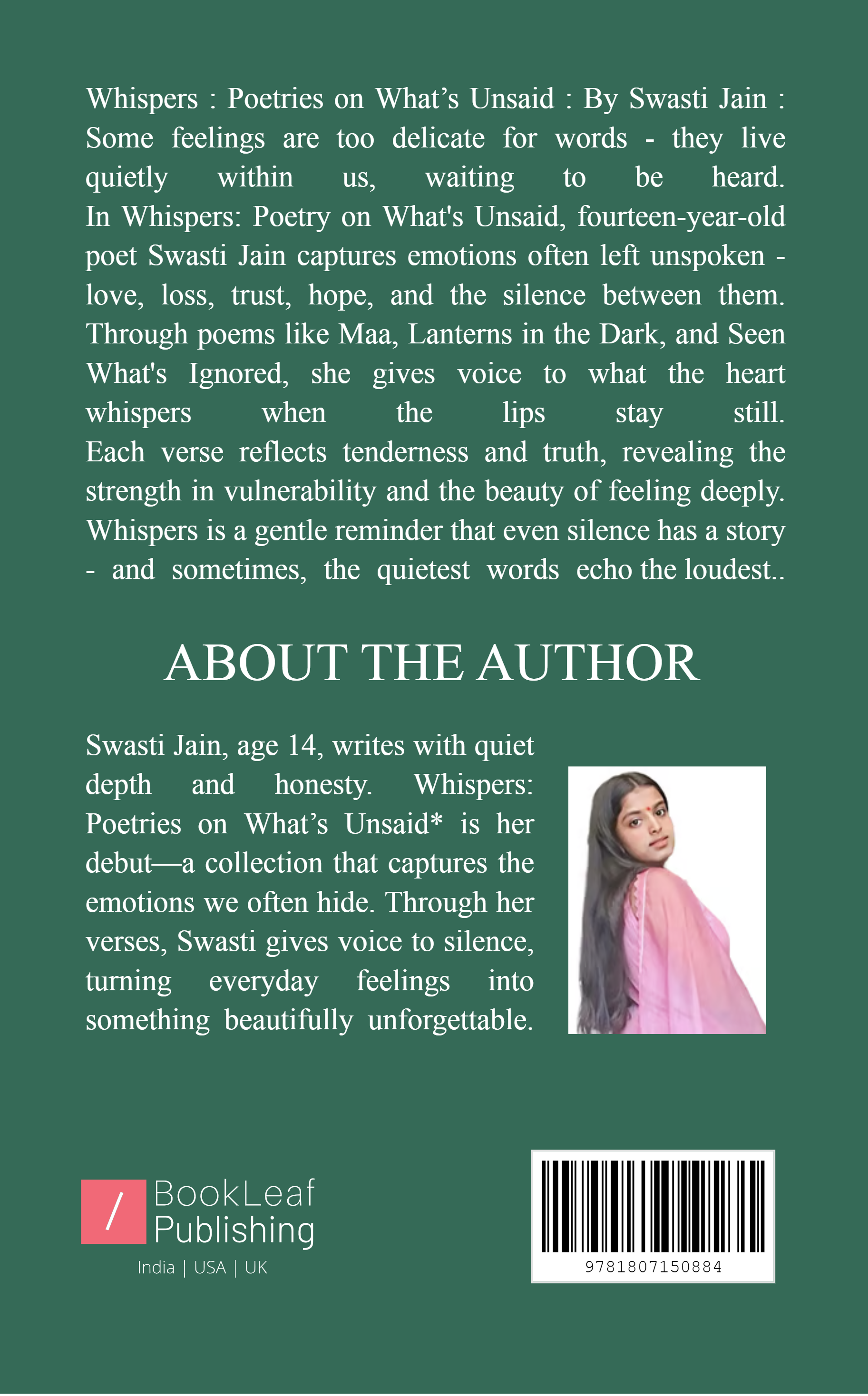 In Whispers: Poetry on What's Unsaid, fourteen-year-old poet Swasti Jain captures emotions often left unspoken - love, loss, trust, hope, and the silence between them. Through poems like Maa, Lanterns in the Dark, and Seen What's Ignored, she gives voice to what the heart whispers when the lips stay still.