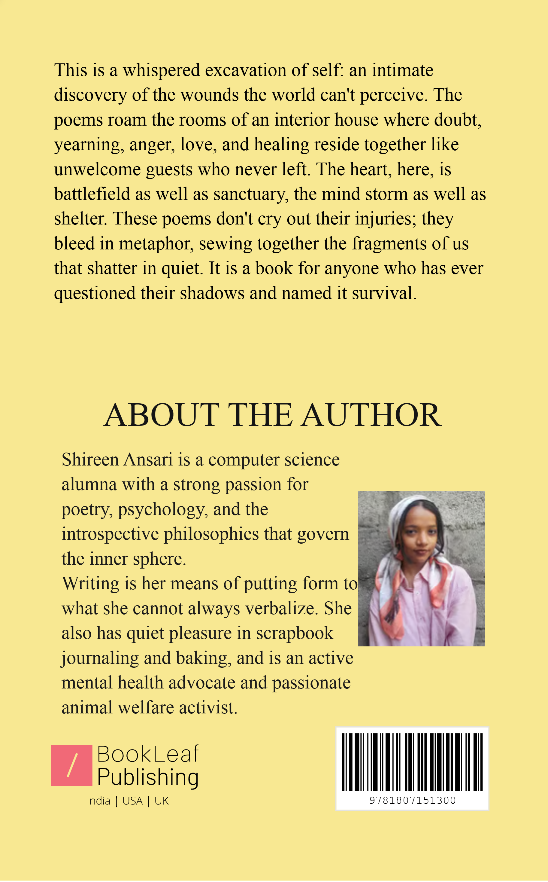 This book is a deeply intimate journey through the poems Shireen has penned in the solitude of her own presence. Born out of moments of self-reflection and inner conflict, these poems are the words she spoke to herself when other forms of expression seemed impossible. Some of the poems are very close to her heart, dating back to the very beginning of her writing life. Each work embodies the stark, unadorned feelings of introspection, providing a realm where inner turmoil, yearning, and exploration are afforded voice and form.