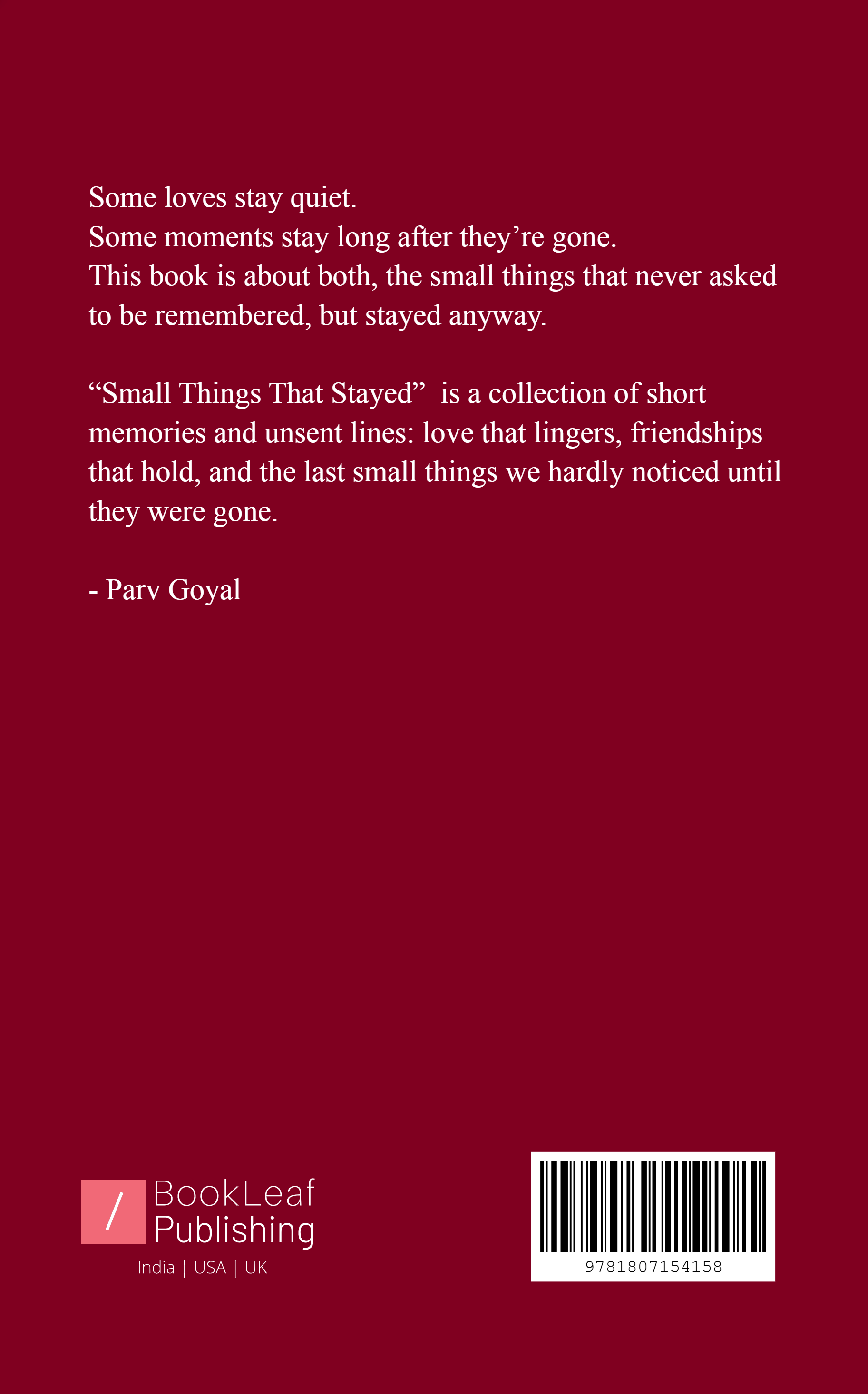 Small Things That Stayed gathers short poems about everyday moments that linger: unsent messages, rooftop nights, corner-shop mornings, and friends whose laughter stays with us. The poems are simple and direct. They focus on how small acts and ordinary details shape memory and feeling. Read slowly—this book asks you to notice and keep the quiet things that matter.