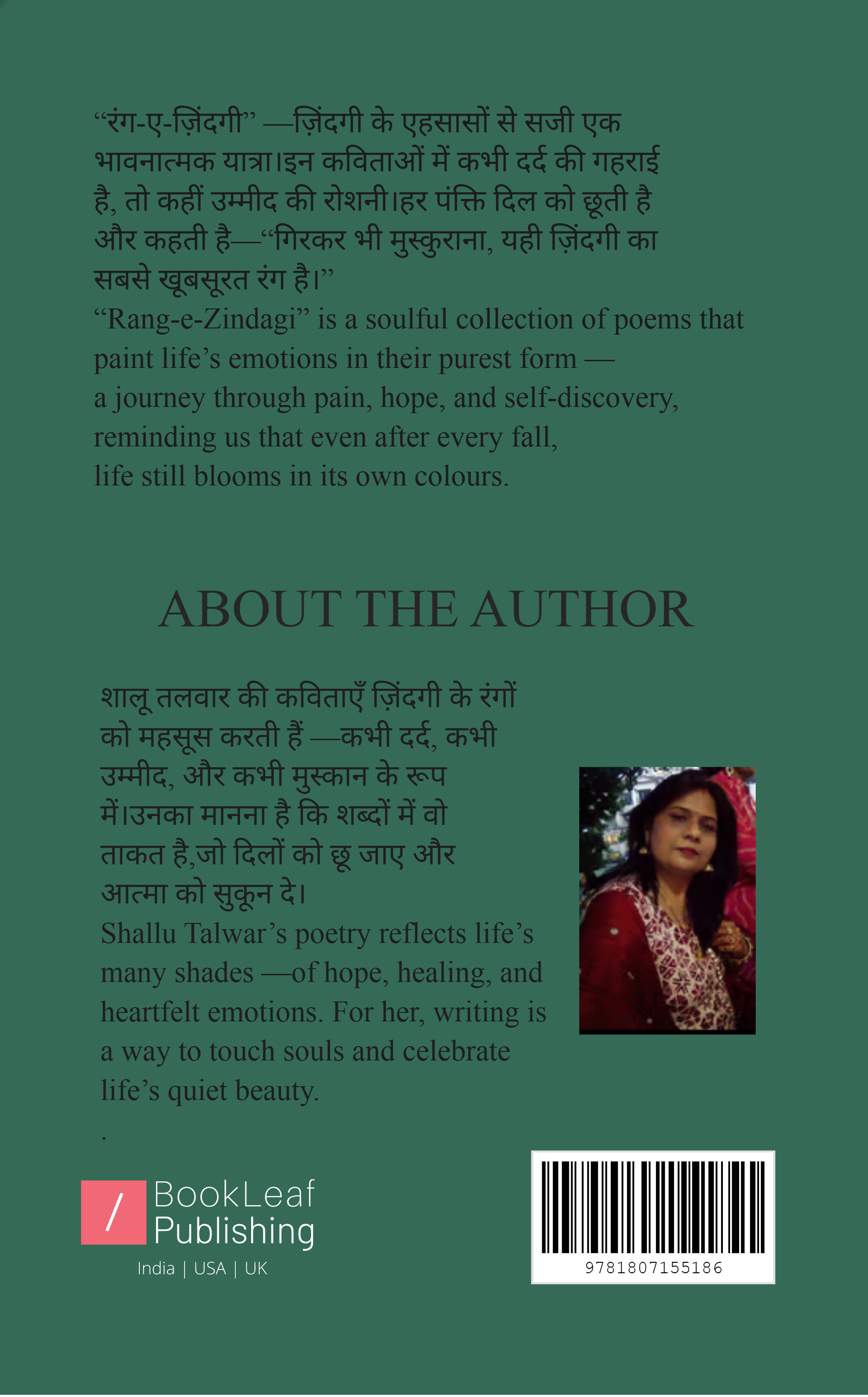 “रंग-ए-ज़िंदगी” —ज़िंदगी के एहसासों से सजी एक भावनात्मक यात्रा।इन कविताओं में कभी दर्द की गहराई है, तो कहीं उम्मीद की रोशनी।हर पंक्ति दिल को छूती है और कहती है—“गिरकर भी मुस्कुराना, यही ज़िंदगी का सबसे खूबसूरत रंग है।”