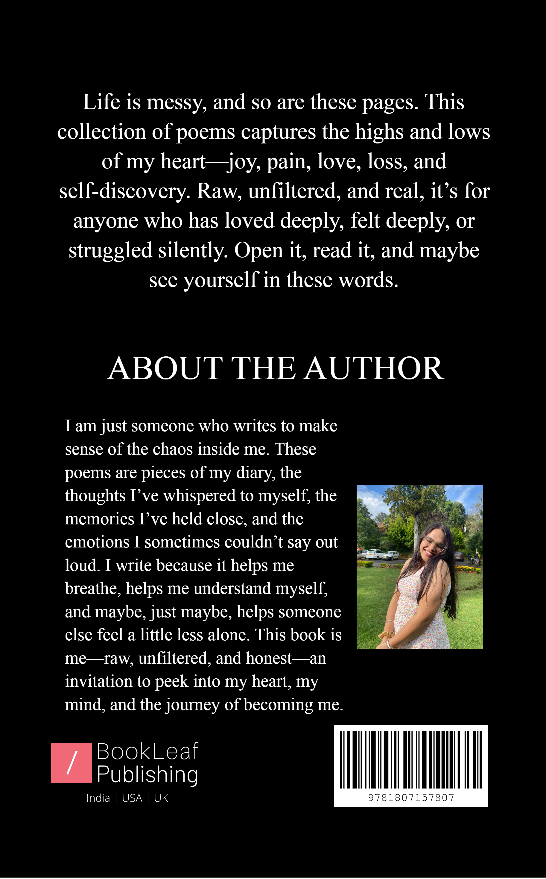 Life is messy, and so are these pages. This collection of poems captures the highs and lows of my heart—joy, pain, love, loss, and self-discovery. Raw, unfiltered, and real, it’s for anyone who has loved deeply, felt deeply, or struggled silently. Open it, read it, and maybe see yourself in these words.