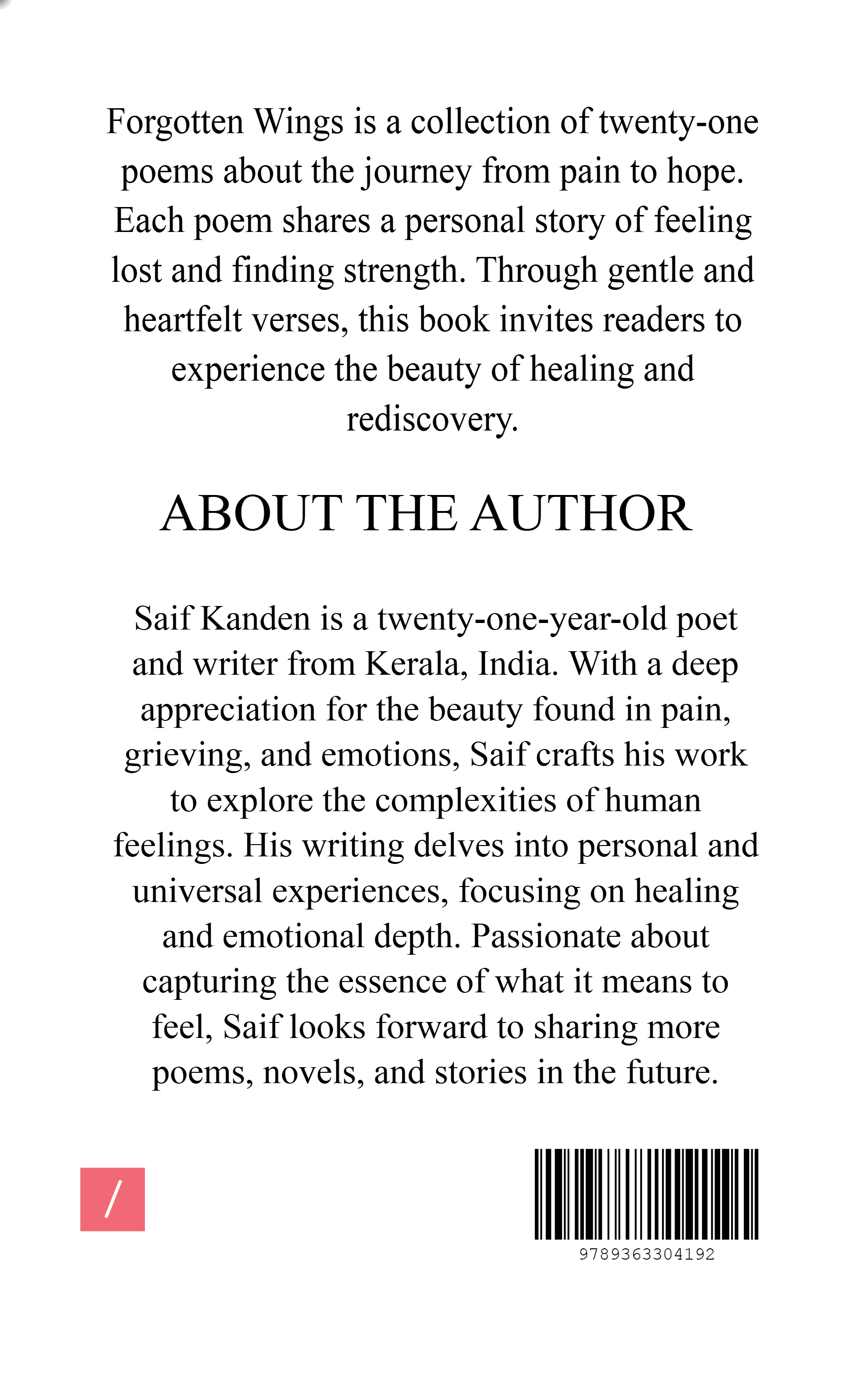Forgotten Wings is a collection of twenty-one poems about the journey from pain to hope. Each poem shares a personal story of feeling lost and finding strength. Through gentle and heartfelt verses, this book invites readers to experience the beauty of healing and rediscovery.