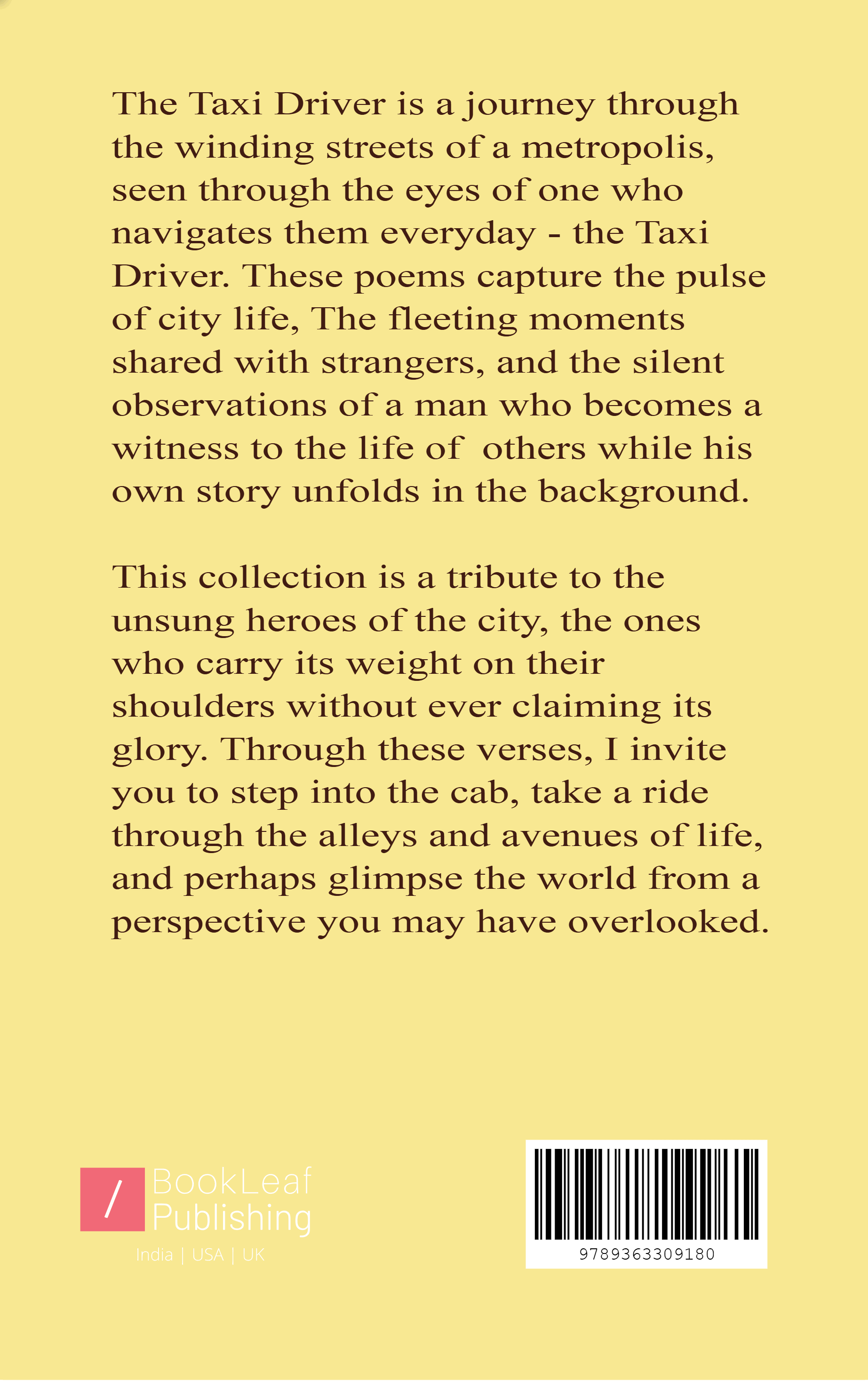 The Taxi Driver offers a vivid exploration of city life through the eyes of a cab driver. Each poem captures the pulse of the metropolis, weaving together stories of passengers, fleeting moments, and the driver’s personal reflections. From the chaos of traffic jams to the quiet of late-night streets, this collection highlights the unnoticed details of urban life. The driver, both an observer and participant, reveals the beauty, struggle, and interconnectedness of everyday encounters. Through these verses, readers are invited to experience the heart of the city in its raw, unfiltered form—one ride at a time.
