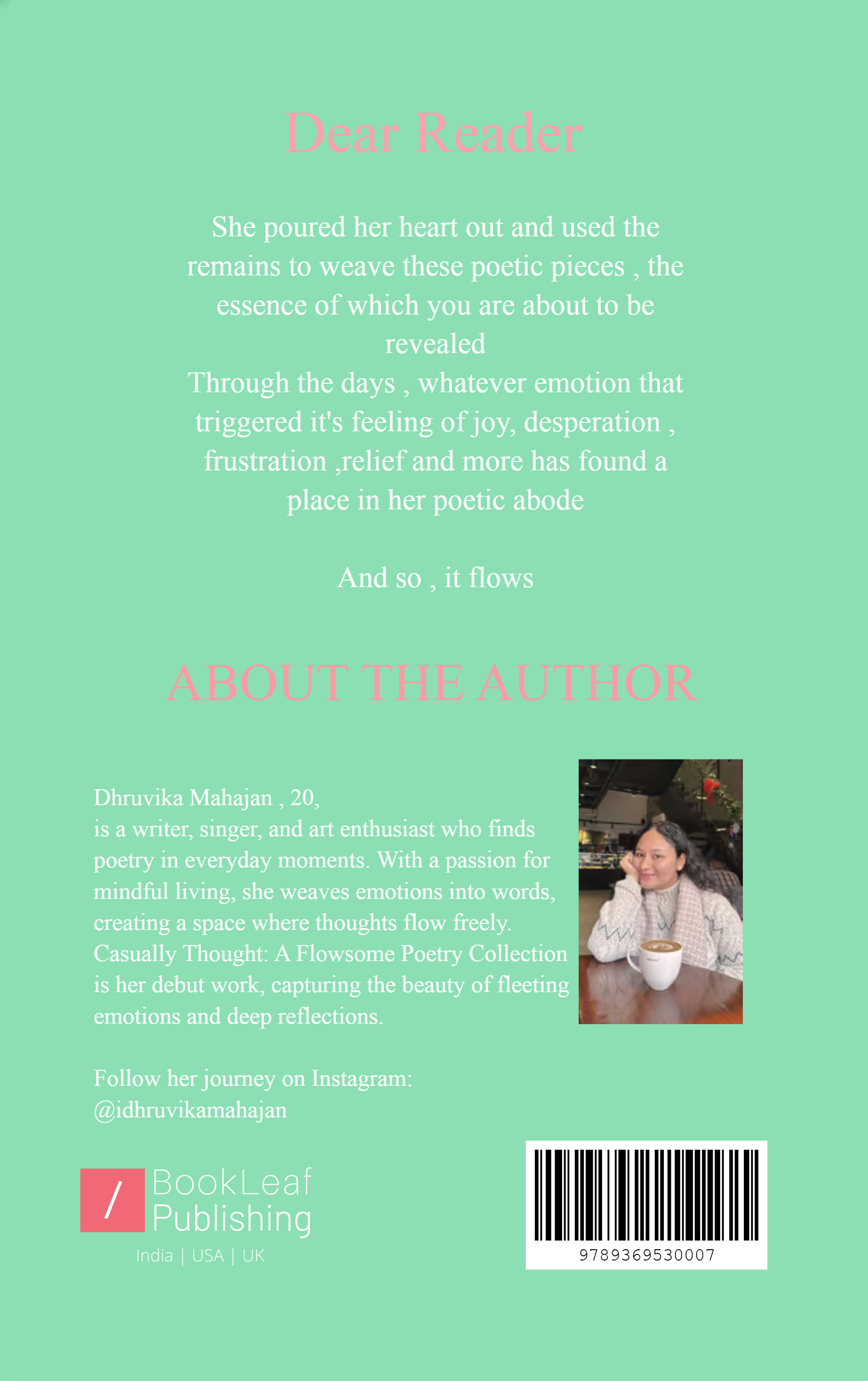 Casually Thought is a heartfelt collection of poetry that captures the beauty of unspoken emotions, quiet reflections, and everyday experiences. With themes of love, longing, self-discovery, and nostalgia, each poem feels like a gentle conversation—honest, raw, and deeply personal. This book is for those who find poetry in simple moments, in the spaces between words, and in emotions that linger long after they are felt. Whether you’re seeking comfort, inspiration, or a place to rest your thoughts, 'Casually Thought' invites you to pause, feel, and embrace the art of simply being.