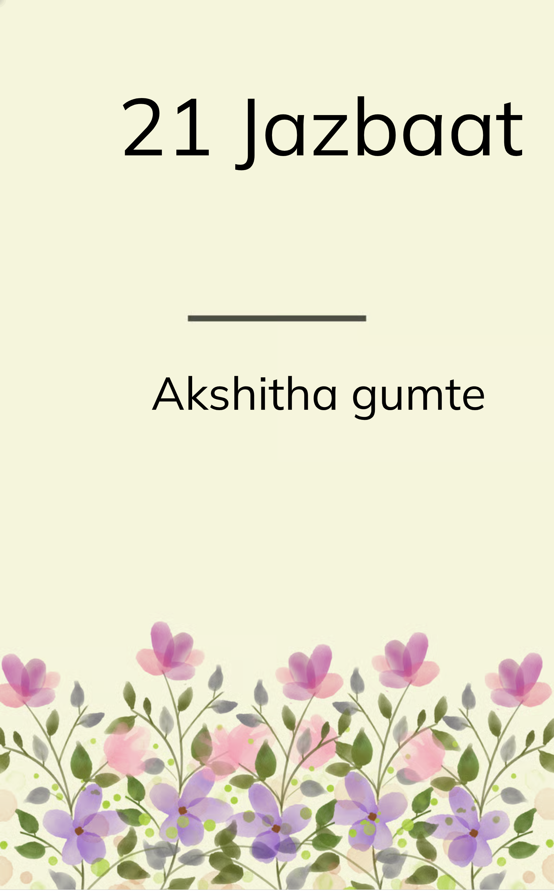 21 Jazbaat is a heartfelt collection of 21 poems, each reflecting a unique emotion from the depths of a young poetess's soul. From love and longing to loss and liberation, every piece carries a piece of her journey - raw, real and unfiltered. These are not just poems; they are whispers of unsaid feelings, battles, and small victories that shape the heart.