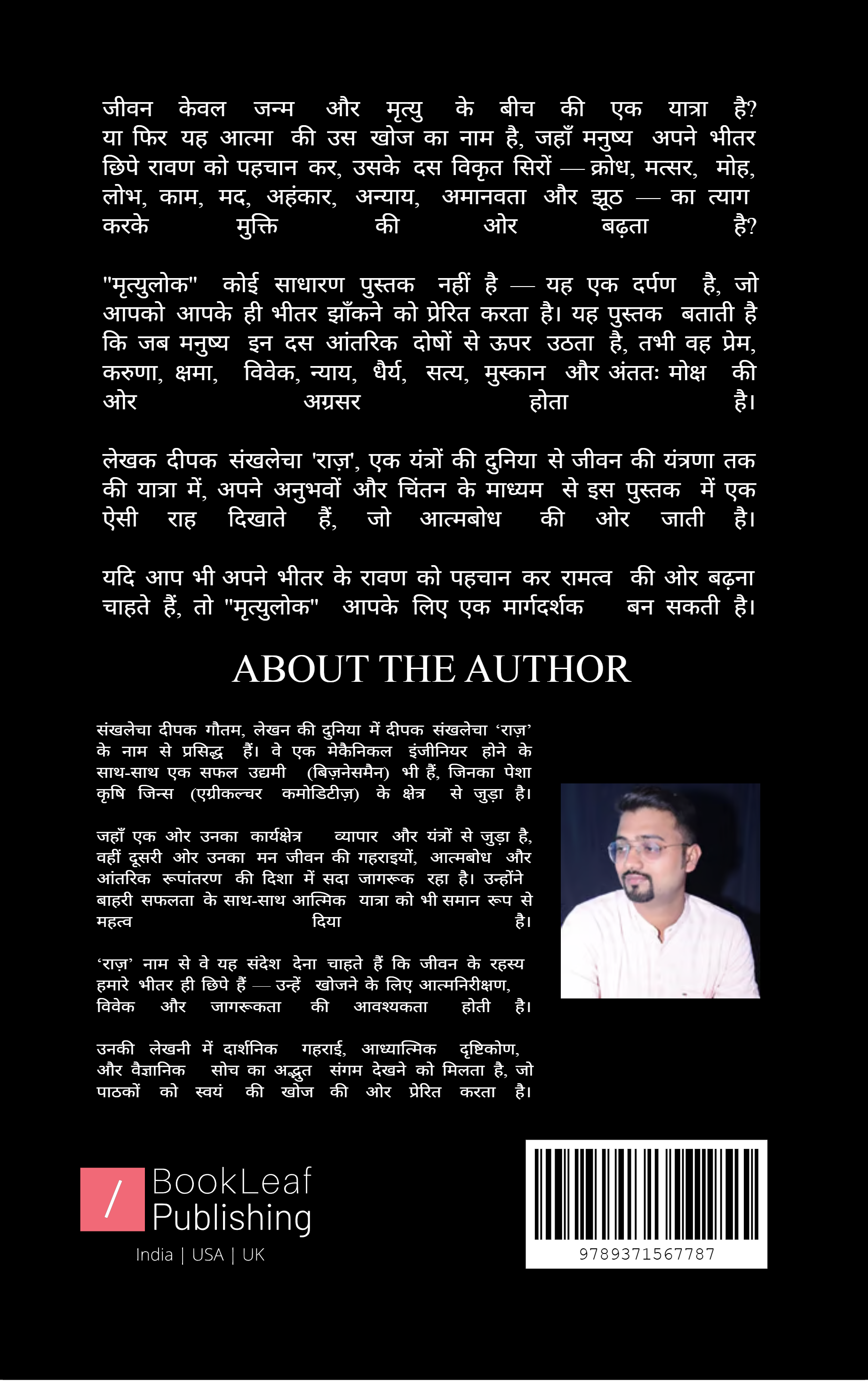 "मृत्युलोक" एक आत्ममंथन की यात्रा है, जो यह प्रश्न उठाती है—क्या जीवन केवल जन्म और मृत्यु के बीच की यात्रा है, या आत्मा की मुक्ति की खोज? यह पुस्तक मनुष्य के भीतर छिपे रावण रूपी दस विकारों — क्रोध, मत्सर, मोह, लोभ, काम, मद, अहंकार, अन्याय, अमानवता और झूठ — को पहचानने और त्यागने की प्रेरणा देती है। लेखक दीपक संखलेचा 'राज़', अपने अनुभवों व चिंतन के माध्यम से पाठकों को प्रेम, करुणा, विवेक, क्षमा और अंततः मोक्ष की ओर ले जाने वाली राह दिखाते हैं। यह पुस्तक आत्मबोध का एक सशक्त दर्पण है।
