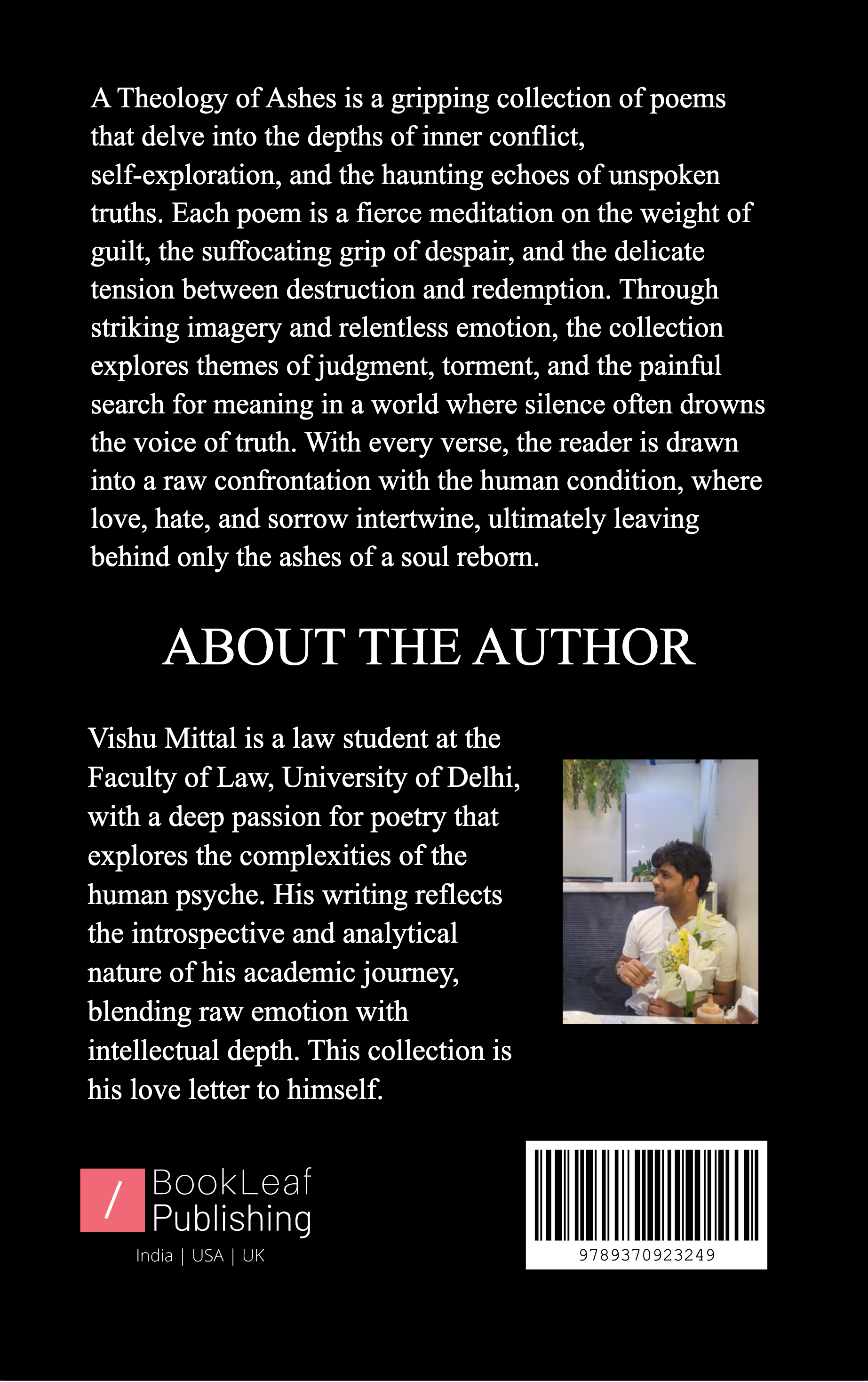 A Theology of Ashes is a gripping collection of poems that delve into the depths of inner conflict, self-exploration, and the haunting echoes of unspoken truths. Each poem is a fierce meditation on the weight of guilt, the suffocating grip of despair, and the delicate tension between destruction and redemption. Through striking imagery and relentless emotion, the collection explores themes of judgment, torment, and the painful search for meaning in a world where silence often drowns the voice of truth. With every verse, the reader is drawn into a raw confrontation with the human condition, where love, hate, and sorrow intertwine, ultimately leaving behind only the ashes of a soul reborn.