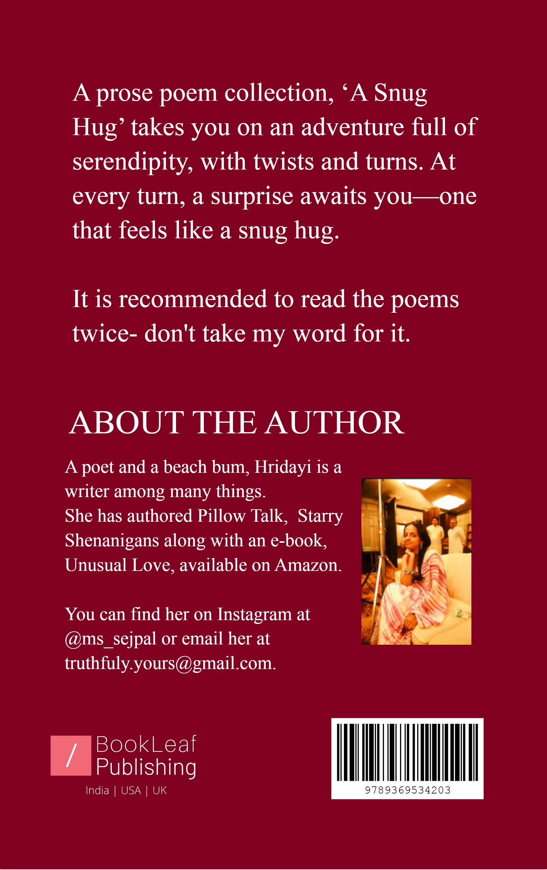 A prose poem collection, ‘A Snug Hug’ takes you on an adventure full of serendipity, with twists and turns. At every turn, a surprise awaits you—one that feels like a snug hug.