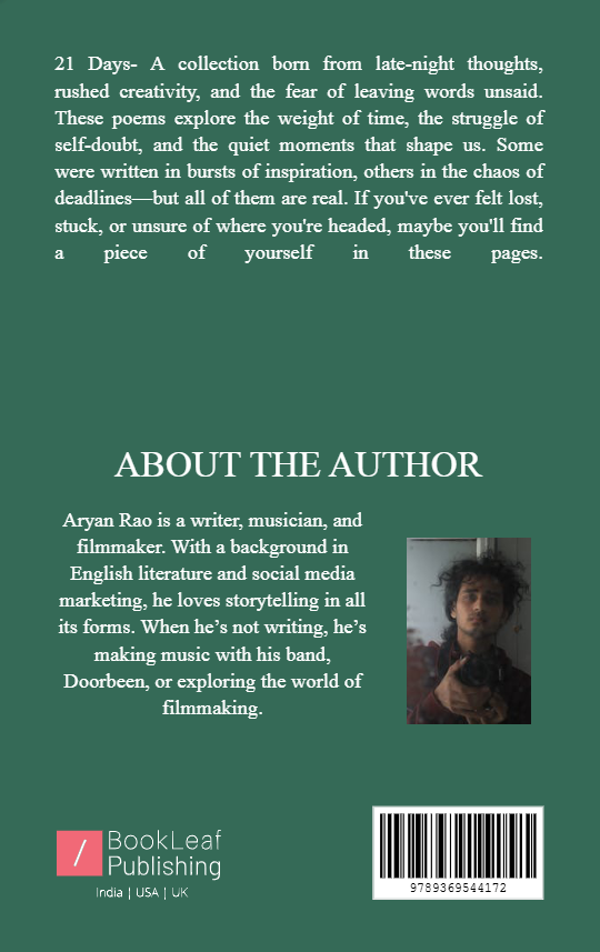 21 Days, is a collection of thoughts, experiences, and fleeting moments put into words. From self-doubt to nostalgia, from dreams to the fear of wasting time, each poem captures a piece of the journey. Some were written in bursts of inspiration, others in a rush to meet the challenge—but all of them are real. This book is for anyone who has ever felt lost, uncertain, or simply searching for meaning in the chaos.