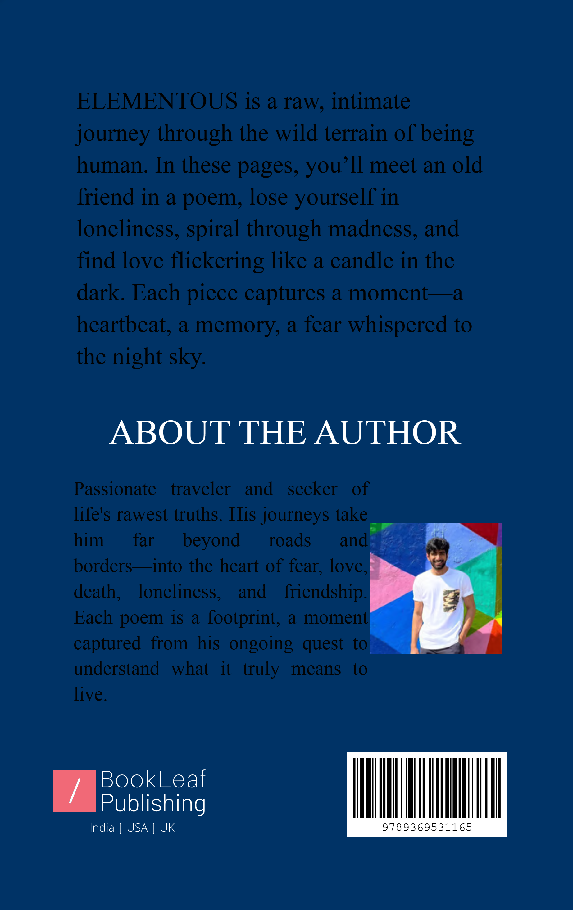 ELEMENTOUS is a raw, intimate journey through the wild terrain of being human. In these pages, you’ll meet an old friend in a poem, lose yourself in loneliness, spiral through madness, and find love flickering like a candle in the dark. Each piece captures a moment—a heartbeat, a memory, a fear whispered to the night sky and many more....