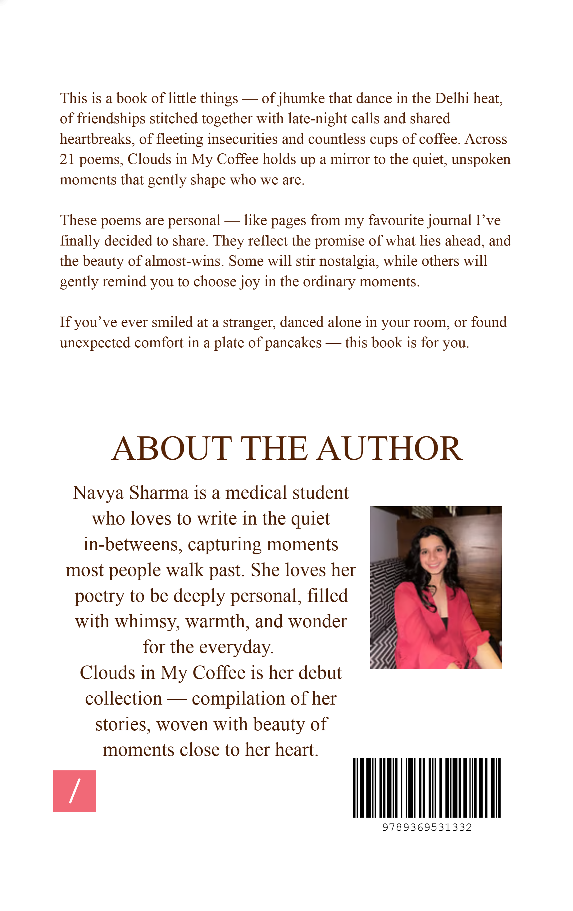 Clouds in My Coffee is a heartfelt collection of 21 poems that find beauty in life’s smallest moments — from the sparkle of jhumke on a hot Delhi day to the comfort of a shared laugh with a friend.