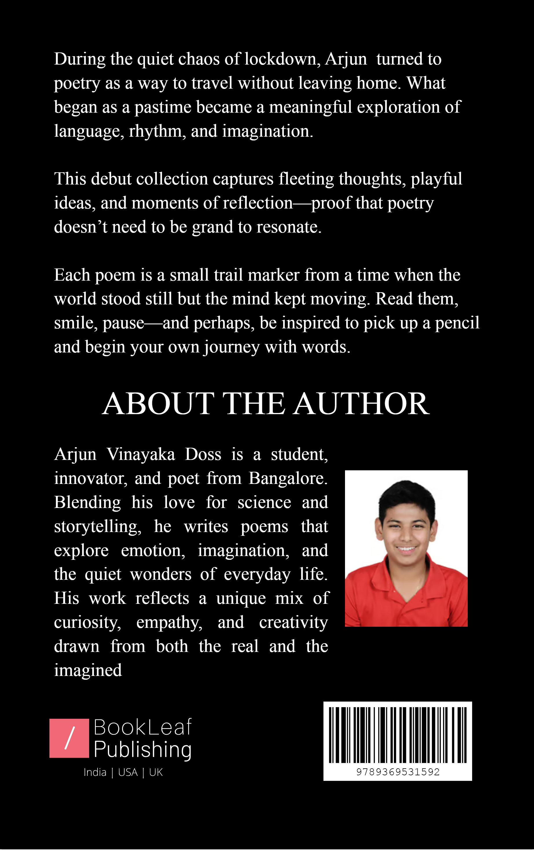 In the stillness of lockdown, when the world felt distant and uncertain, poetry became my refuge. What started as a way to pass time soon evolved into a dialogue—with myself, with language, and now, with you. This book isn’t about innovation or philosophy; it simply exists because words, when woven with rhythm and playfulness, can bring joy. These poems mark the paths I wandered when the physical world was closed off—sometimes whimsical, sometimes contemplative, but always honest. I hope these pages inspire you to pick up a pencil and let your own words take flight.