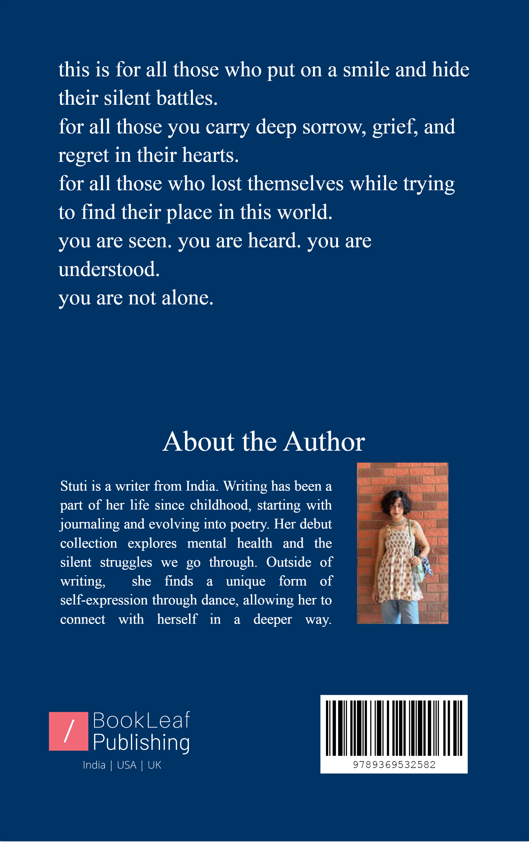 An evocative collection of poems discovering the raw and often painful realities of mental health. From the depths of depression and anxiety to the weight of self-doubt and loss, this book shows how the absence of love and understanding can shape our dark moments. Through the verses, poetess gets into the experience of watching past selves fade away, navigating overwhelming empathy, and grappling with personal loss. A powerful, heartfelt journey into the complexities of the human mind.