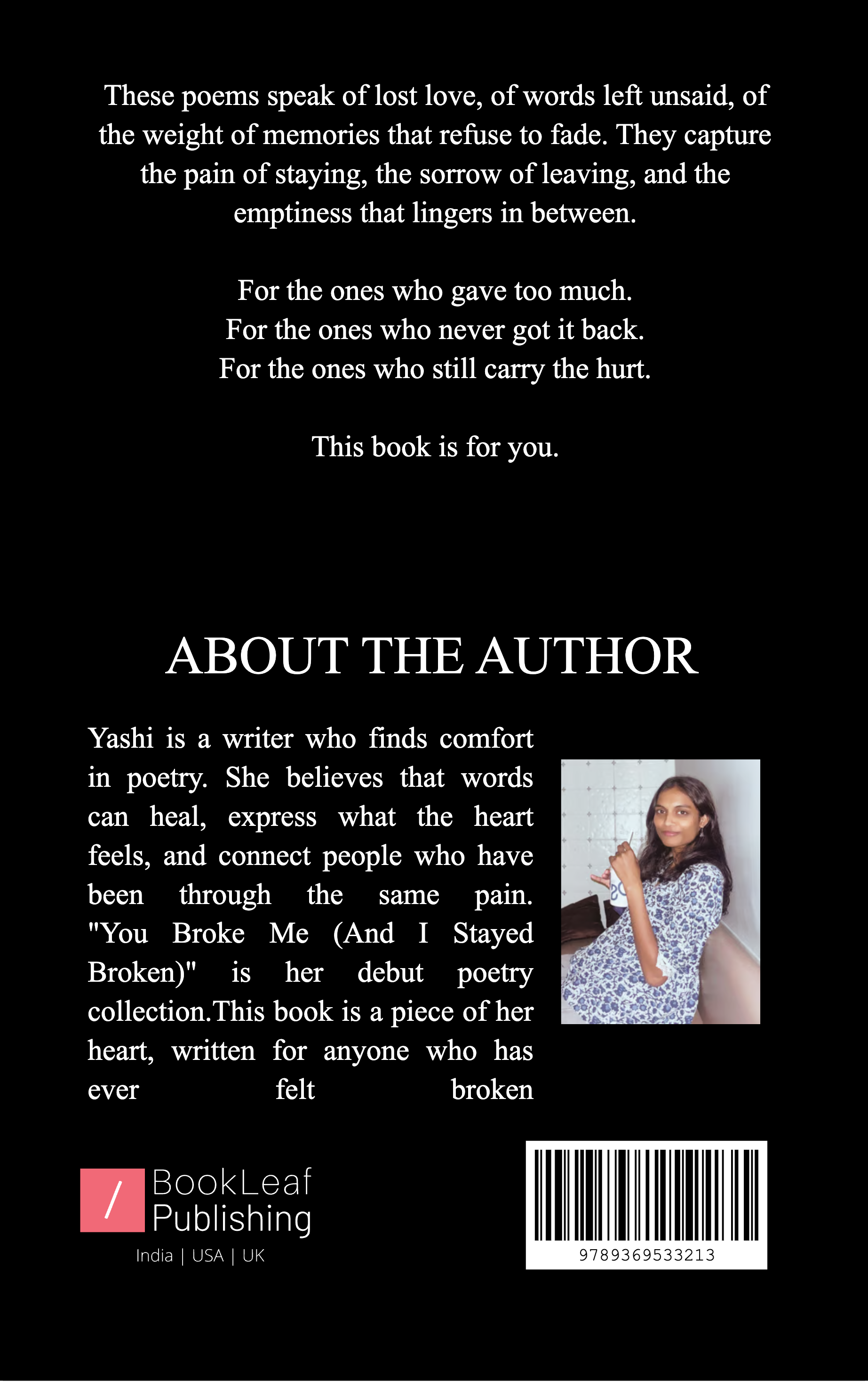 "You Broke Me (And I Stayed Broken)" is a collection of poems about heartbreak, loss, and the ache that lingers long after love is gone. It speaks of wounds that never heal, memories that refuse to fade, and the quiet pain of holding on to something that no longer exists.