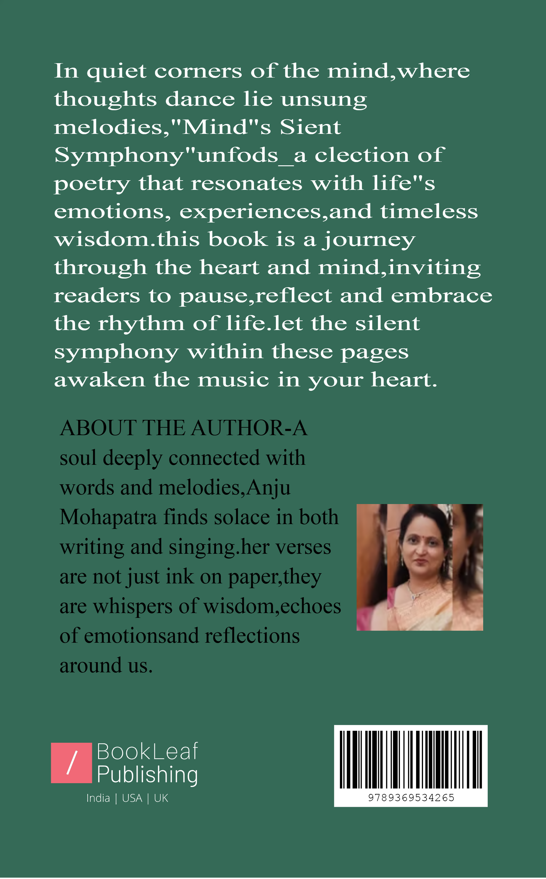 In the quiet corners of the mind,where thoughts dance like unsung melodies,"Mind's Silent Symphony" unfolds_a collection of poetry that resonates with life's emotions,experiences,and timeless wisdom.This book is a journey through the heart and mind,invitingreaders to pause,reflect and embrace the rhythm of life.Let the silent symphony within these pages awaken the music in your heart......