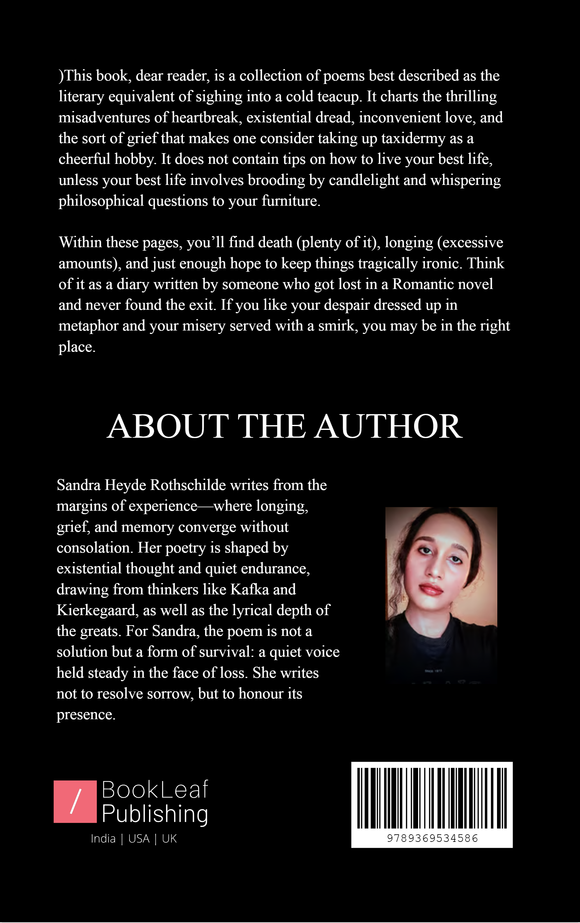 This book, dear reader, is a collection of poems best described as the literary equivalent of sighing into a cold teacup. It charts the thrilling misadventures of heartbreak, existential dread, inconvenient love, and the sort of grief that makes one consider taking up taxidermy as a cheerful hobby. It does not contain tips on how to live your best life, unless your best life involves brooding by candlelight and whispering philosophical questions to your furniture.
