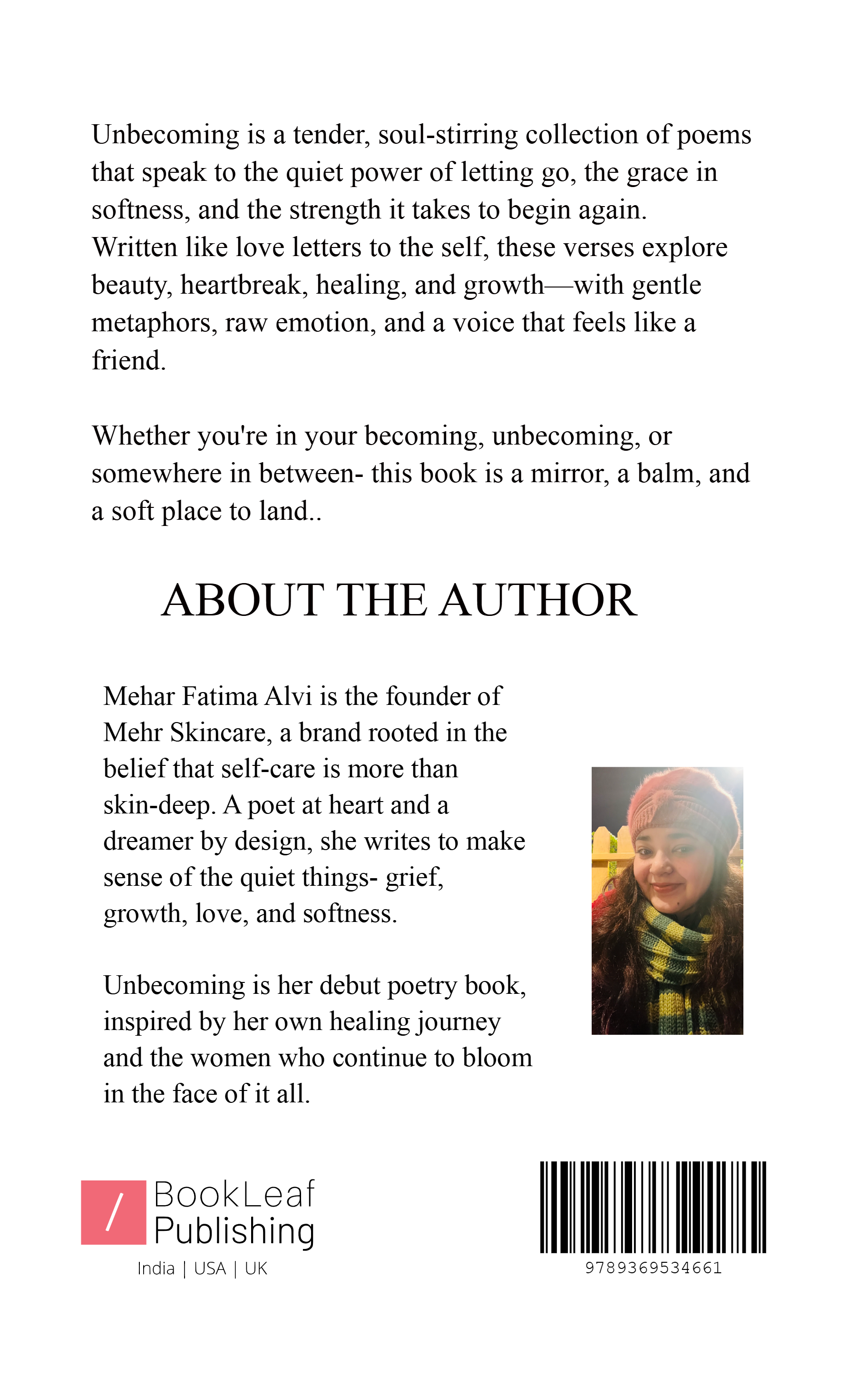 Unbecoming is a raw, gentle collection of poems about healing, self-love, and starting over. Through verses that feel like soft confessions, it reminds readers that growth doesn’t always look perfect, and that unbecoming who you are not the first step to becoming who you are.