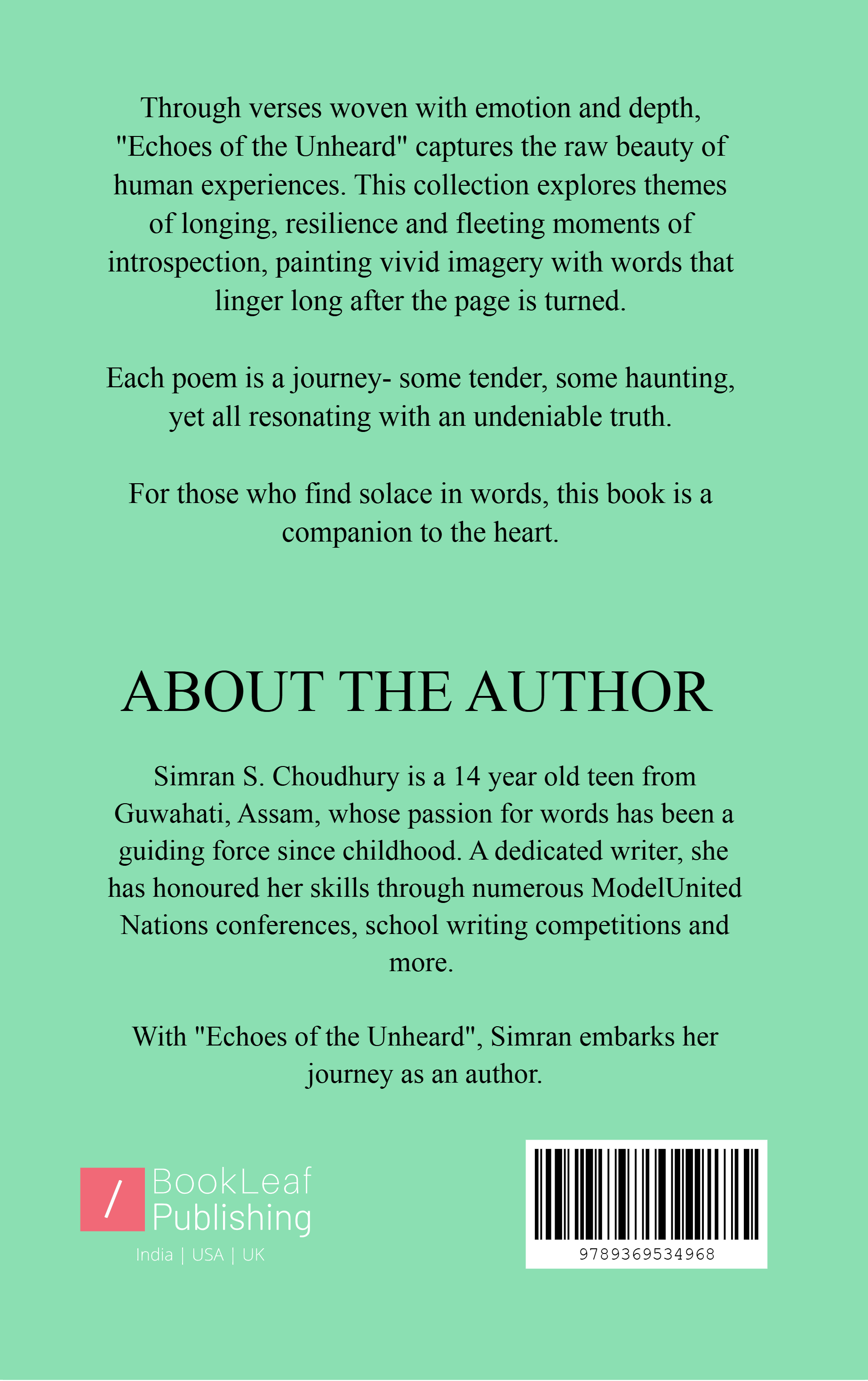 "Echoes of the Unheard" is a heartfelt collection of poetry that explores emotions, experiences, and fleeting moments of life. Through vivid imagery and raw expression, Simran S. Choudhury weaves verses that capture love longing, resilience, and self discovery. Each poem invites readers into a world of deep reflection, where words become a mirror to the soul. Written with sincerity and passion, this debut collection resonates with anyone who has ever felt the weight of emotions unspoken. Whether seeking solace, inspiration or a quiet escape, "Echoes of the Unheard" offers a poetic journey that lingers long after the last page.