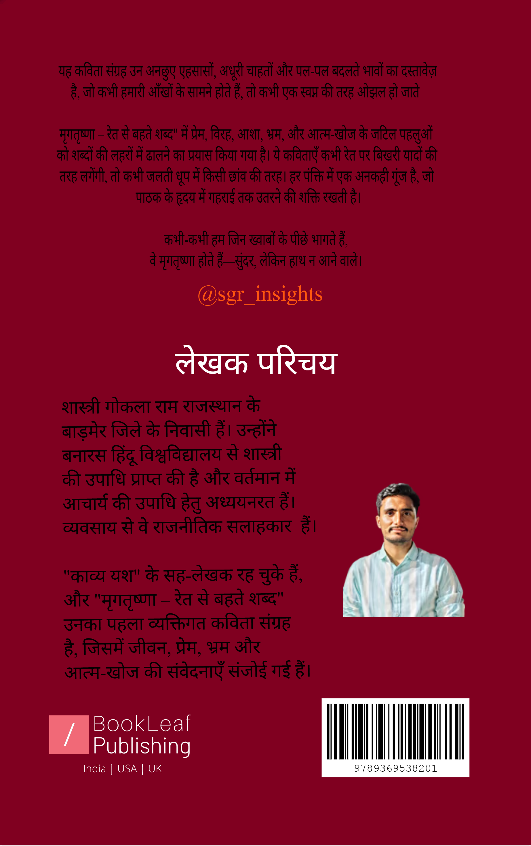 "मृगतृष्णा – रेत से बहते शब्द" में प्रेम, विरह, आशा, भ्रम, और आत्म-खोज के जटिल पहलुओं को शब्दों की लहरों में ढालने का प्रयास किया गया है। ये कविताएँ कभी रेत पर बिखरी यादों की तरह लगेंगी, तो कभी जलती धूप में किसी छांव की तरह। हर पंक्ति में एक अनकही गूंज है, जो पाठक के हृदय में गहराई तक उतरने की शक्ति रखती है।