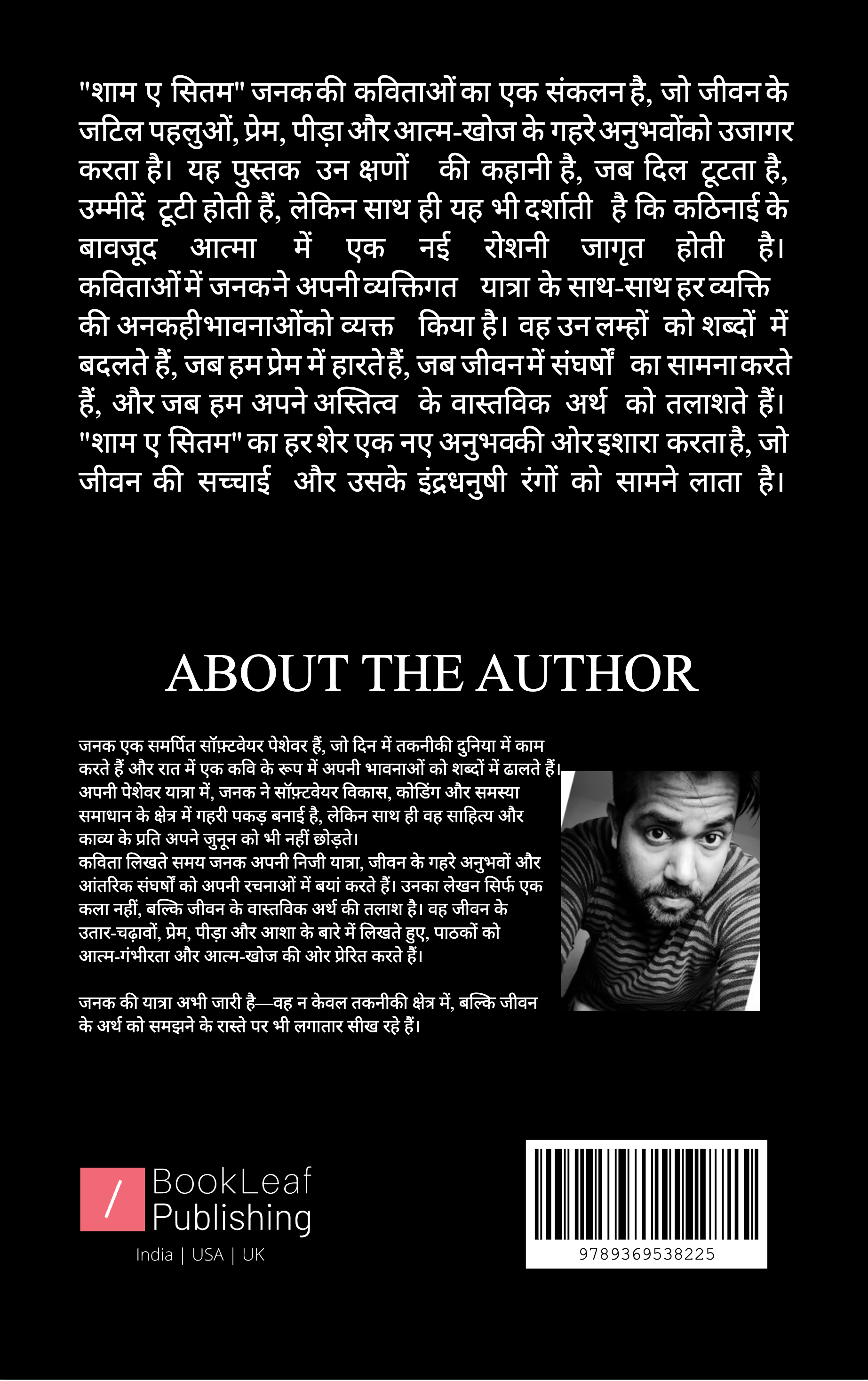 "शाम ए सितम" जनक की कविताओं का एक संकलन है, जो जीवन के जटिल पहलुओं, प्रेम, पीड़ा और आत्म-खोज के गहरे अनुभवों को उजागर करता है। यह पुस्तक उन क्षणों की कहानी है, जब दिल टूटता है, उम्मीदें टूटी होती हैं, लेकिन साथ ही यह भी दर्शाती है कि कठिनाई के बावजूद आत्मा में एक नई रोशनी जागृत होती है।