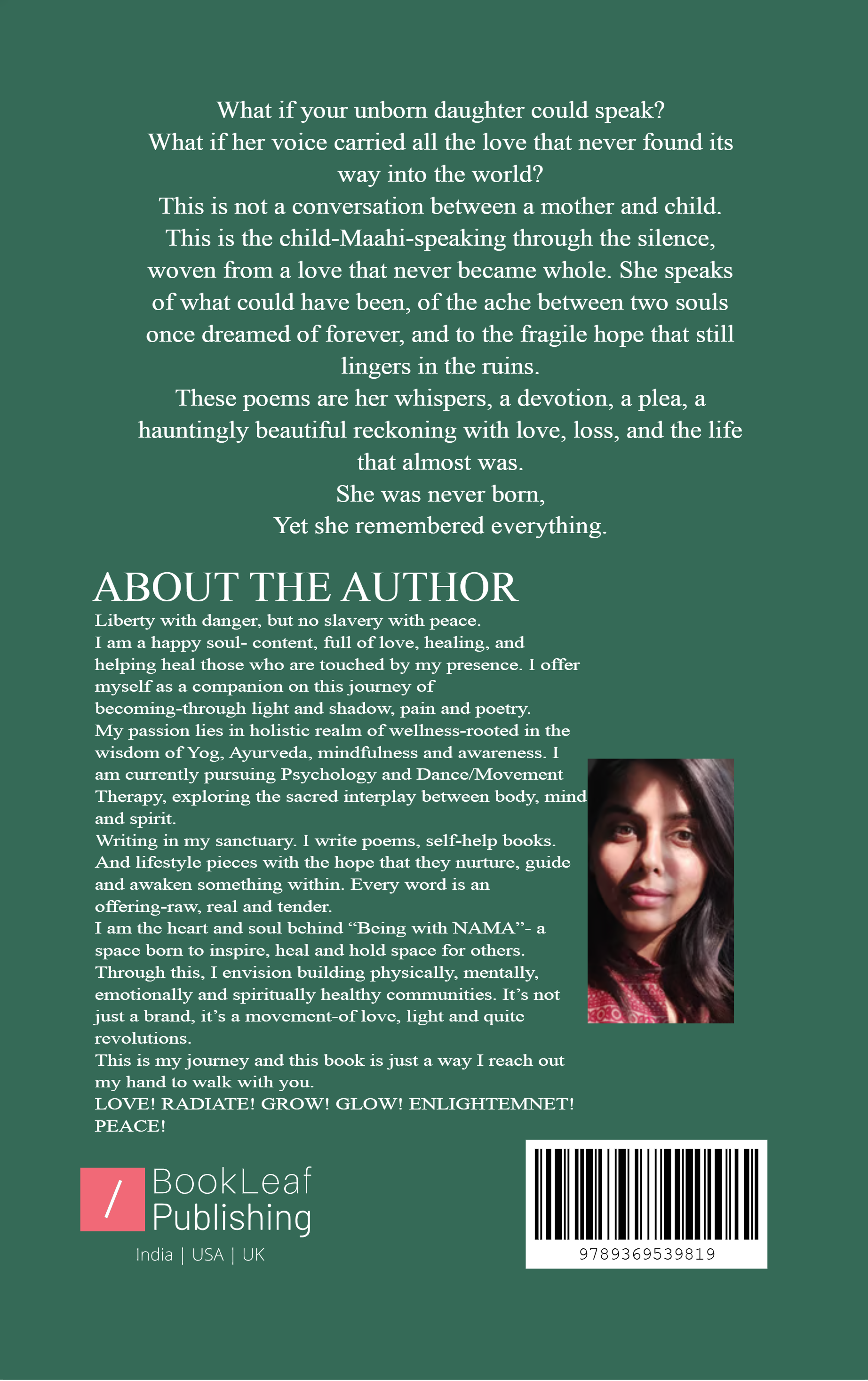 "Maahi – Your Unborn Daughter” is a poetic tribute to love that never reached its full bloom. Written in the voice of Maahi — an unborn daughter — this book captures the echoes of a mother’s devotion and longing for a love that once felt eternal. Through phases of innocence, chaos, heartbreak, and remembrance, Maahi speaks for the child who witnessed everything in silence. This is not just a book of poems — it's a soul's offering, a daughter’s voice, and a mother’s heart laid bare. A hauntingly beautiful reminder of love that lingers, even when the people don’t.