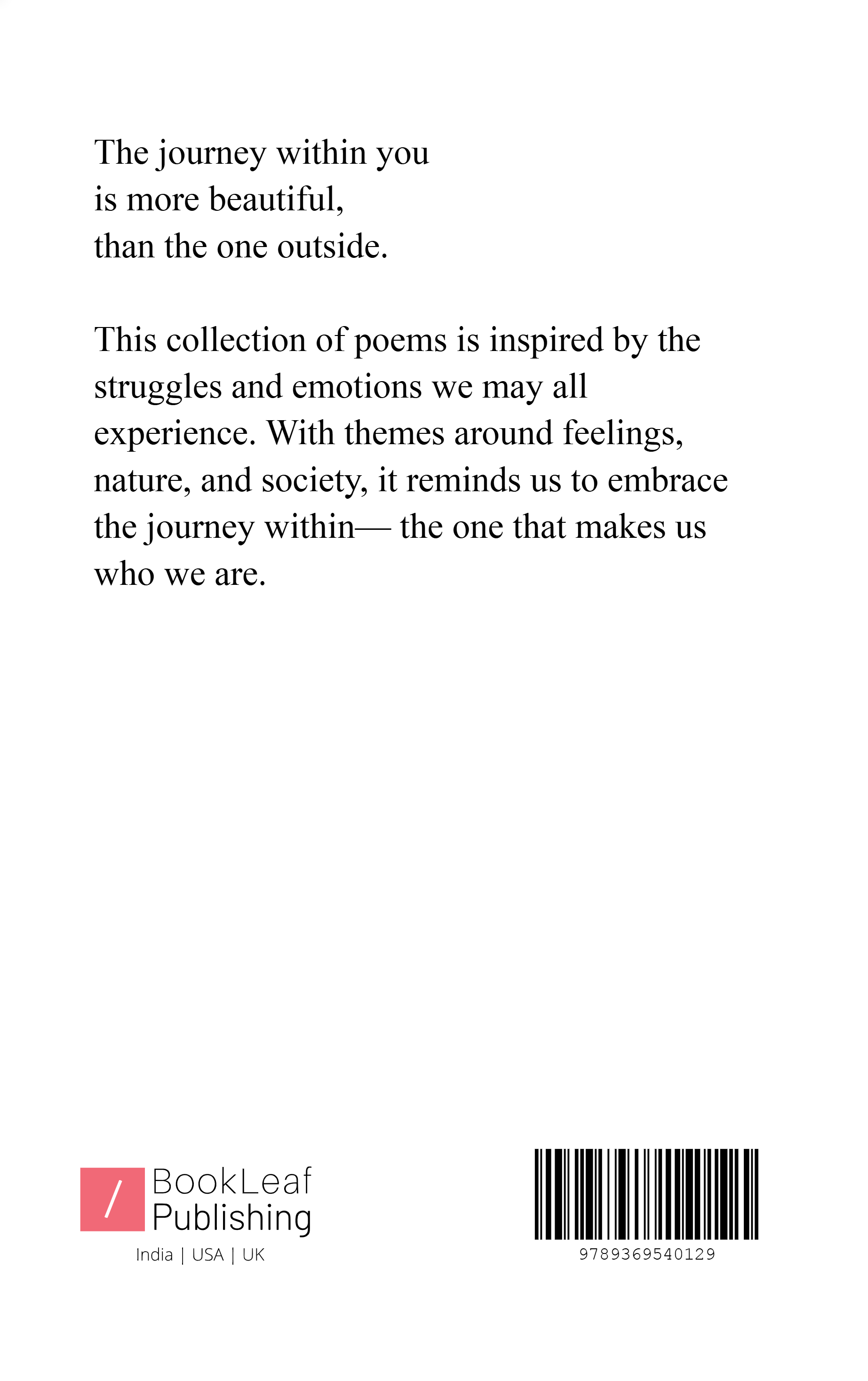 The journey within is more beautiful than the one outside. With themes around feelings, nature, and society, "The Journey Within" is a collection of poems that encourages readers to embrace the connection they have with themselves. While exploring the emotions we may all experience, it reminds us to value the little pieces that make us who we are even, during our struggles and connect with our inner selves.