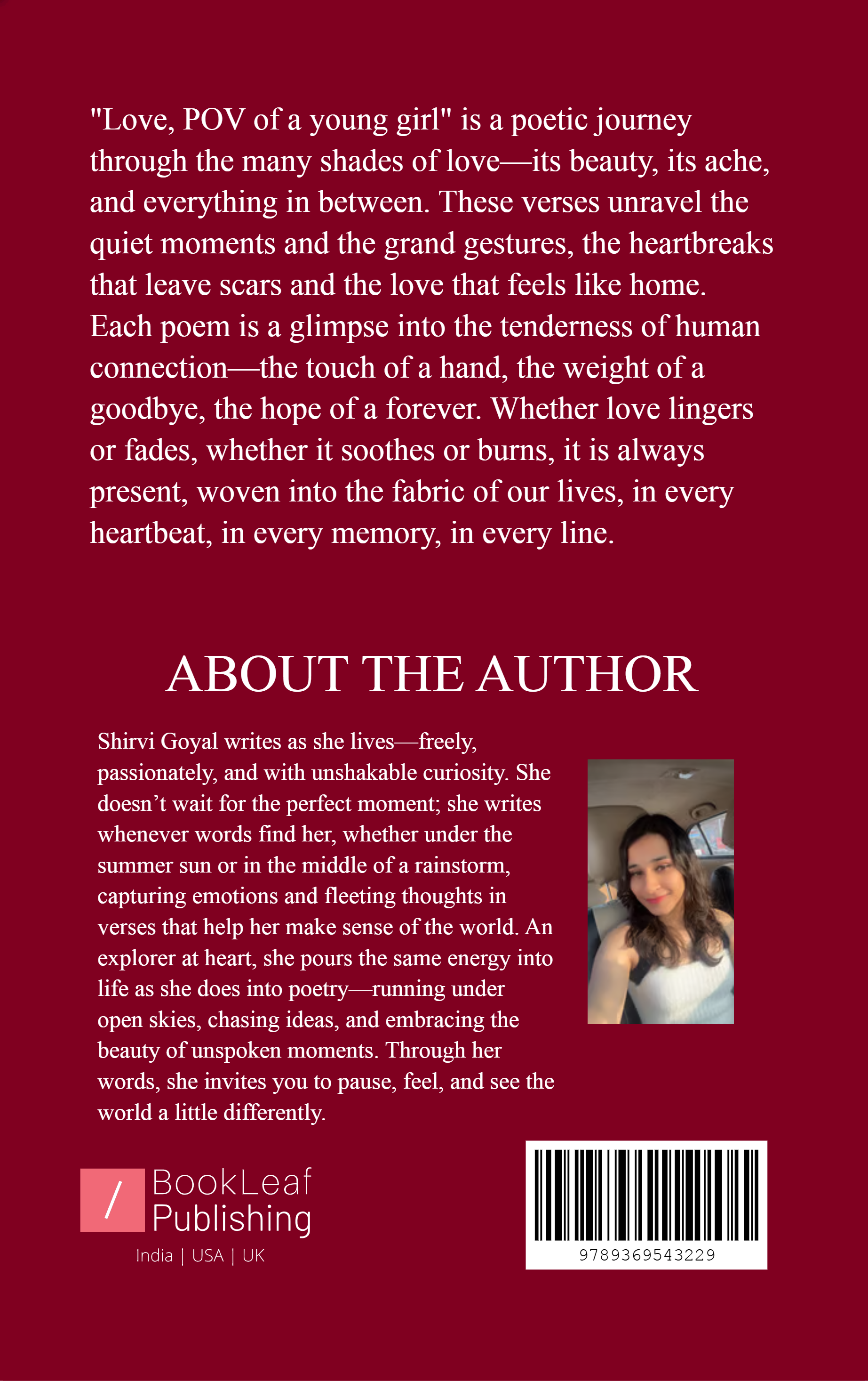 "Love, POV of a young girl" is a poetic journey through the many shades of love—its beauty, its ache, and everything in between. These verses unravel the quiet moments and the grand gestures, the heartbreaks that leave scars and the love that feels like home. Each poem is a glimpse into the tenderness of human connection—the touch of a hand, the weight of a goodbye, the hope of a forever. Whether love lingers or fades, whether it soothes or burns, it is always present, woven into the fabric of our lives, in every heartbeat, in every memory, in every line.