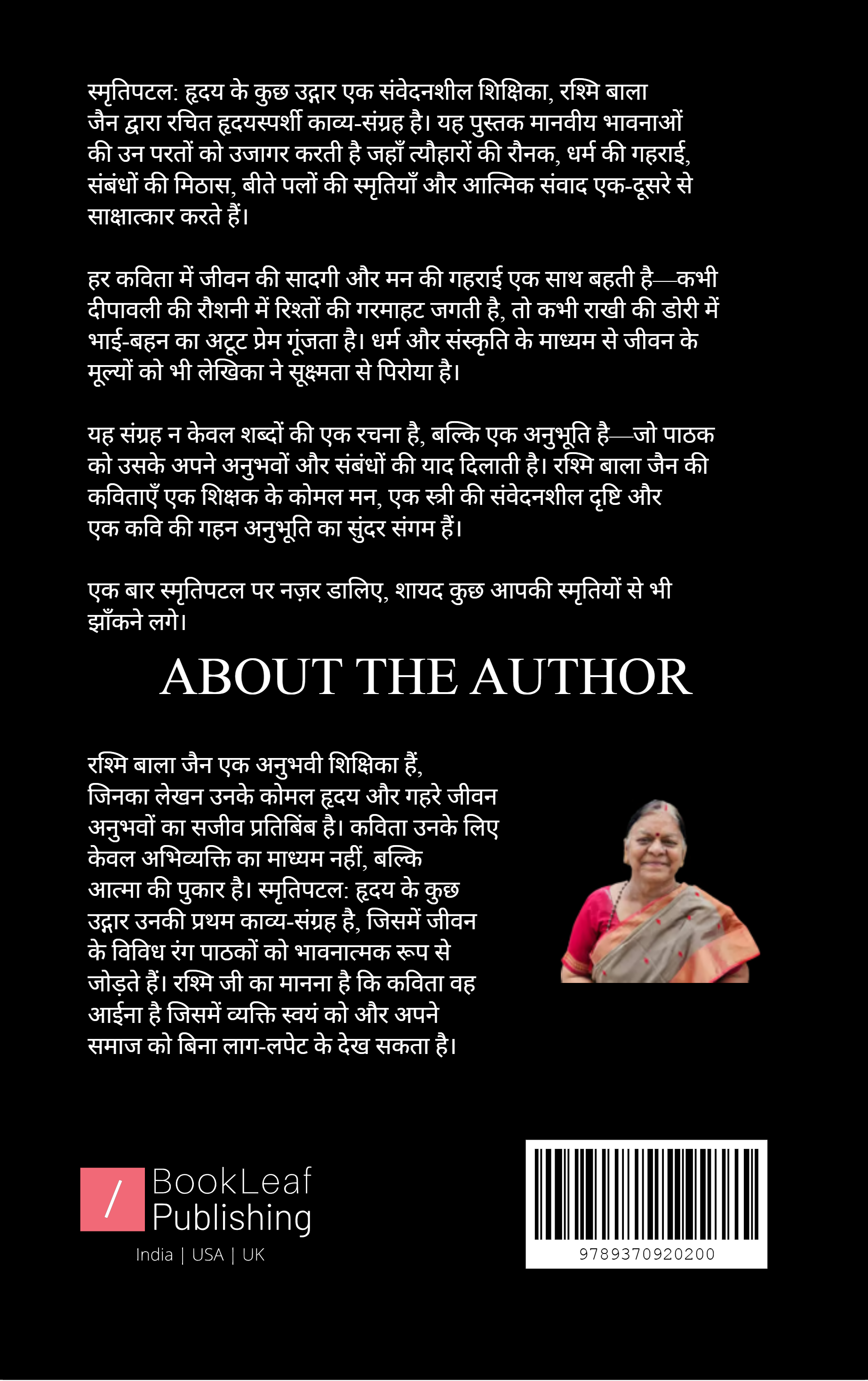 Smritipatal: Hridya Ke Kuch Udgar is a heartfelt Hindi poetry collection by educator and poet Rashmi Bala Jain. Touching on themes like festivals, faith, memories, relationships, and soulful conversations, this book offers readers a nostalgic and emotional journey through life's tender moments. Written in a simple yet expressive style, each poem resonates with warmth, culture, and human connection—making it a perfect read for lovers of reflective and culturally rooted poetry.