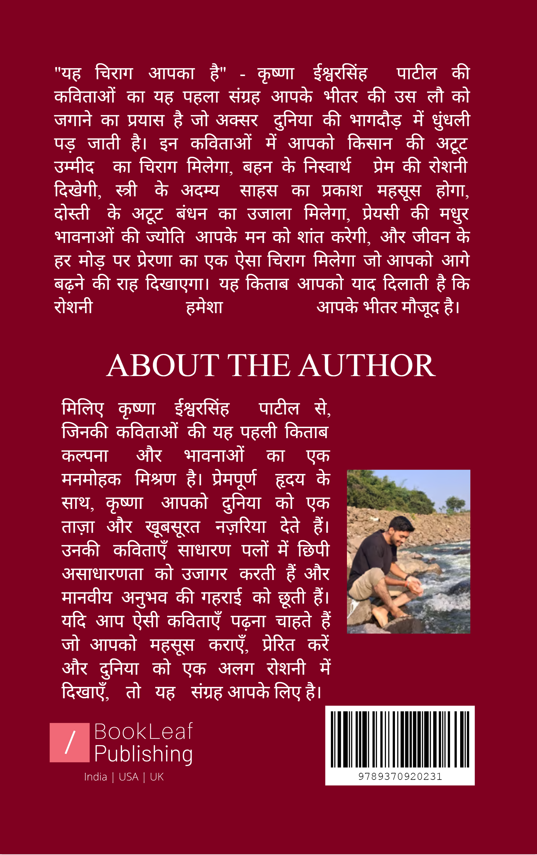 "Yeh Chirag Aapka Hai" - this debut collection of poems by Krishna Ishwar Singh Patil is an attempt to ignite the flame within you that often dims in the hustle and bustle of the world. In these poems, you will find the lamp of a farmer's unwavering hope, witness the light of a sister's selfless love, feel the radiance of a woman's indomitable courage, encounter the glow of friendship's unbreakable bond, experience the tranquility of a beloved's sweet emotions, and discover a beacon of inspiration at every turn of life that will guide you forward. This book reminds you that the light always resides within you.
