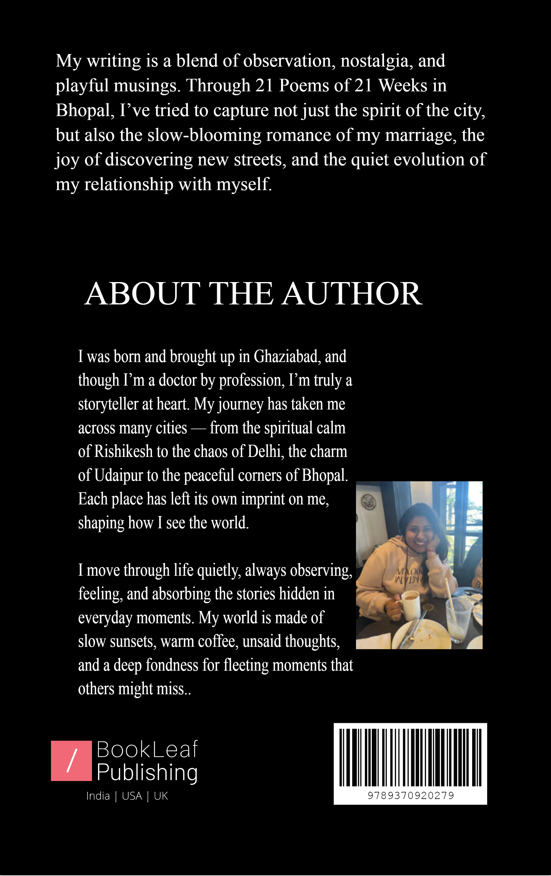 21 Poems of 21 Weeks in Bhopal is a poetic journey through the heart of a city and the quiet corners of everyday life. Written by a dentist with a public health soul and a poet’s heart, this collection captures the charm of Bhopal its lakes, lanes, monsoon skies, and chai breaks. These poems are born from real moments: scooty rides, cold coffees, and slow, thoughtful evenings. This book is for everyone who has ever moved to a new place and slowly built a home for those who find belonging in unfamiliar streets and poetry in the everyday.