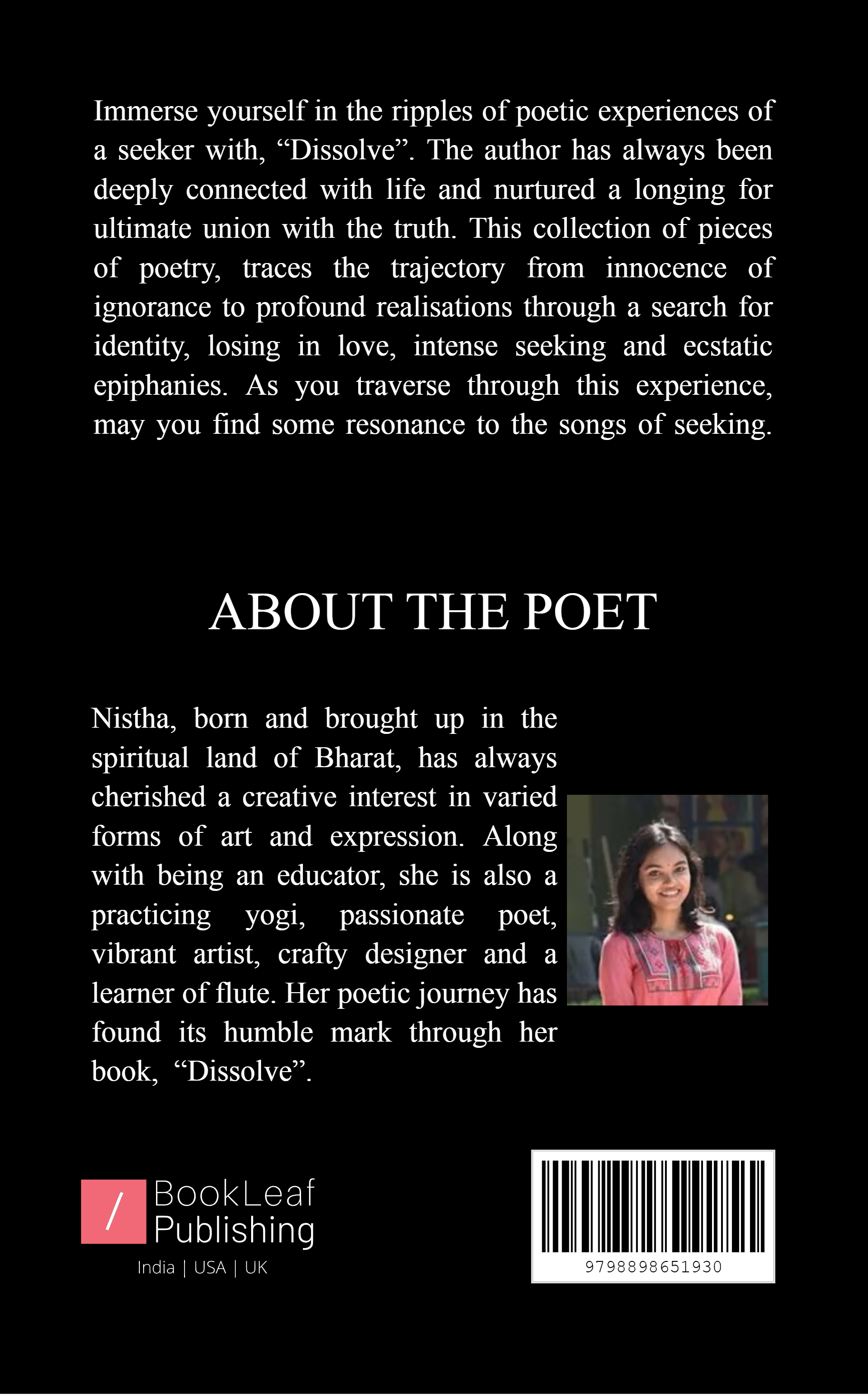 Immerse yourself in the ripples of poetic experiences of a seeker with, “Dissolve”. The author has always been deeply connected with life and nurtured a longing for ultimate union with the truth. This collection of pieces of poetry, traces the trajectory from innocence of ignorance to profound realisations through a search for identity, losing in love, intense seeking and ecstatic epiphanies. As you traverse through this experience, may you find some resonance to the songs of seeking.