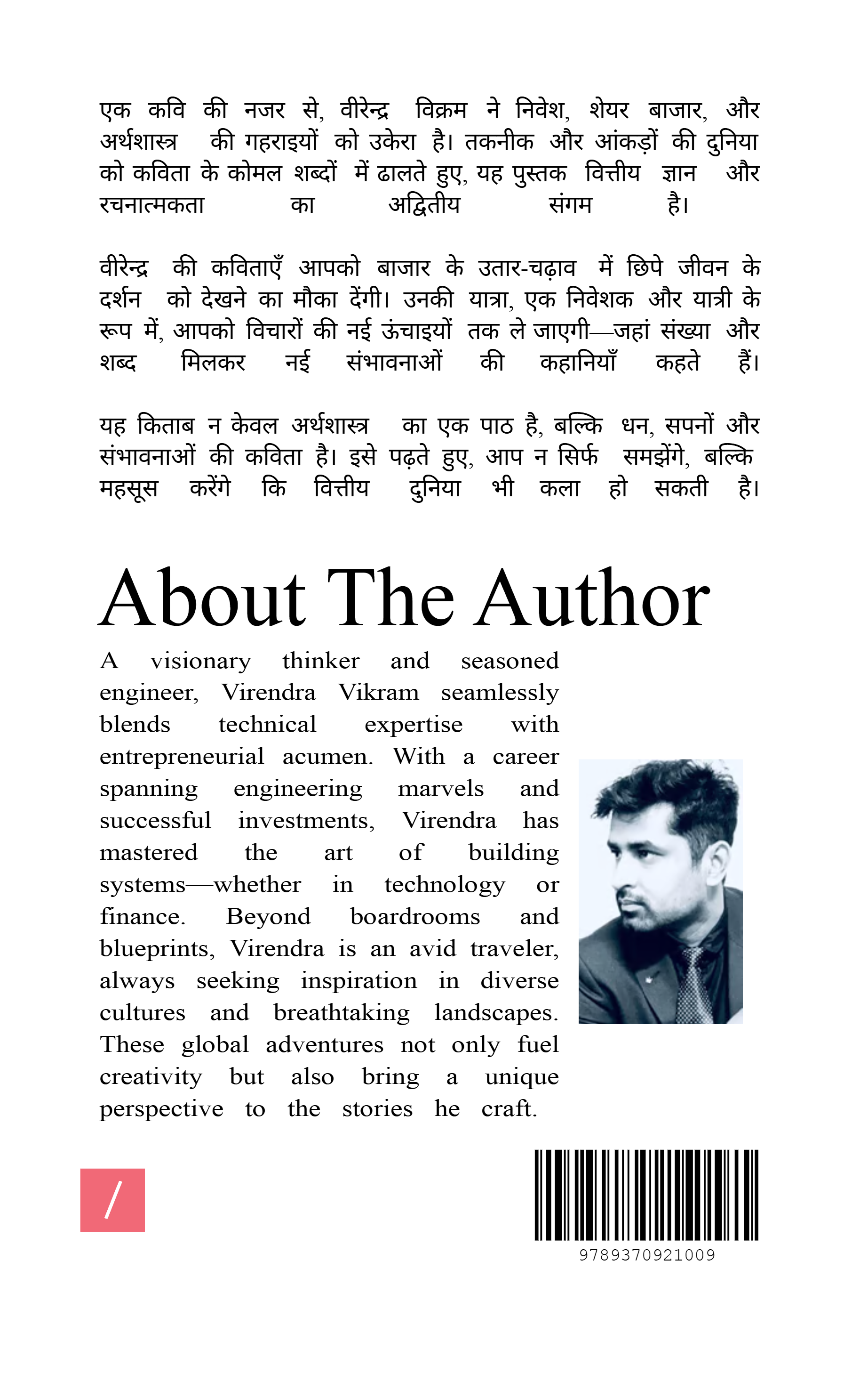 एक कवि की नजर से, वीरेन्द्र विक्रम ने निवेश, शेयर बाजार, और अर्थशास्त्र की गहराइयों को उकेरा है। तकनीक और आंकड़ों की दुनिया को कविता के कोमल शब्दों में ढालते हुए, यह पुस्तक वित्तीय ज्ञान और रचनात्मकता का अद्वितीय संगम है।