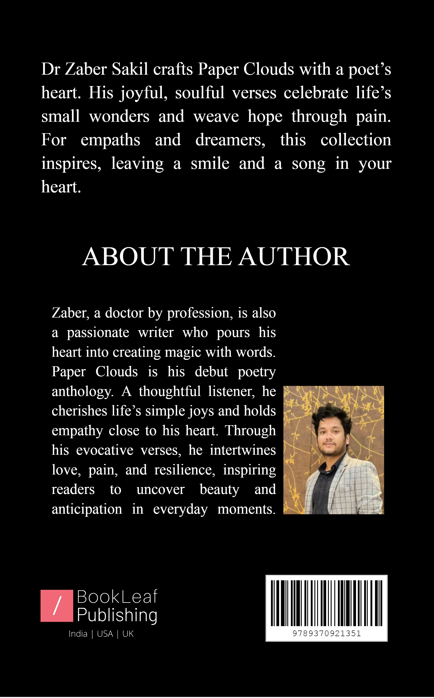 Paper Clouds is a soulful poetry collection celebrating life’s joys and resilience. With a poet’s heart, Zaber crafts vibrant verses that dance from sunlit smiles to quiet reflections, weaving love, pain, and hope. His empathetic voice, shaped by healing others, speaks to dreamers and empaths, offering solace through nature’s imagery—clouds, stars, rivers. From uplifting odes to introspective depths, these poems guide readers to find beauty in every moment, leaving a warm smile and renewed spirit.