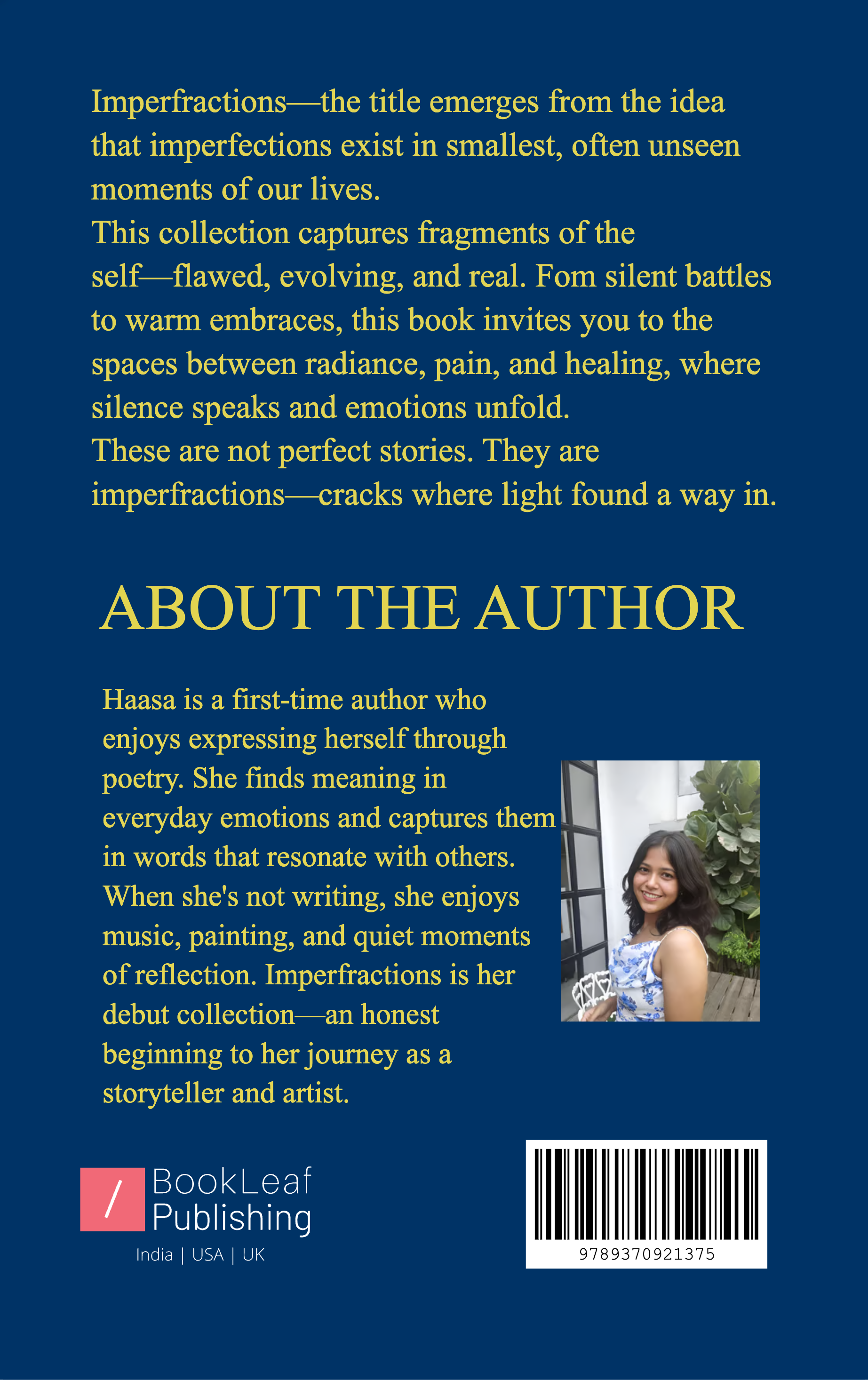 Imperfractions was born from quiet reflections and the emotions tucked within everyday life. These 23 poems are a testament to how deeply ordinary moments can shape us—through pain, doubt, hope and healing. This collection captures the slow, tender journey of mending, reminding us that becoming whole is not about perfection, but about embracing each imperfect part. With each poem, you’re invited to pause, breathe, and feel. Come connect with your imperfect fractions—and find your own light woven through the cracks.