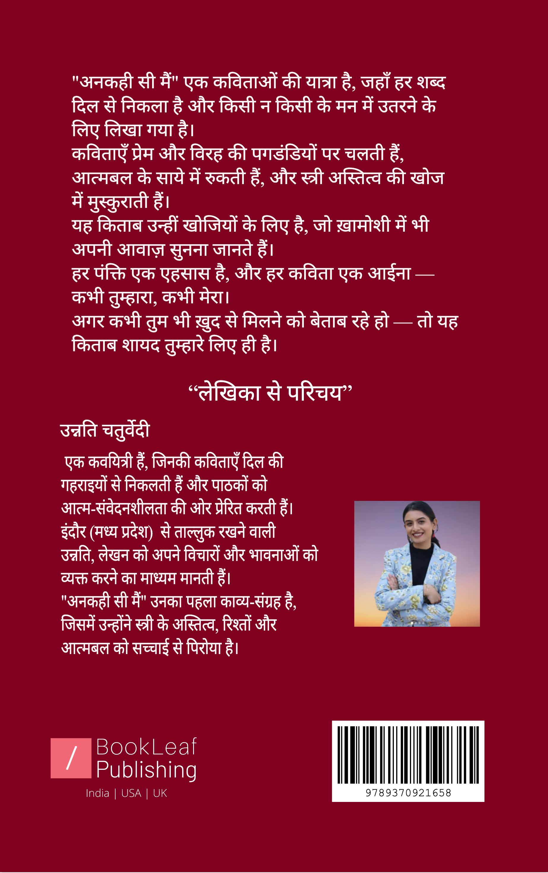 अनकही सी मैं” is a soul-stirring collection of Hindi poems that captures the raw emotions we often leave unspoken. Spanning themes of love, loss, inner strength, identity, and womanhood, each poem invites the reader into a moment of personal revelation. These verses serve as mirrors—sometimes reflecting heartbreak, sometimes resilience—and always offering a gentle space for healing. This book is more than poetry; it is an emotional journey that validates our deepest feelings and encourages us to find our own voice. “अनकही सी मैं” speaks to anyone who has ever felt too much and struggled to say it out loud.