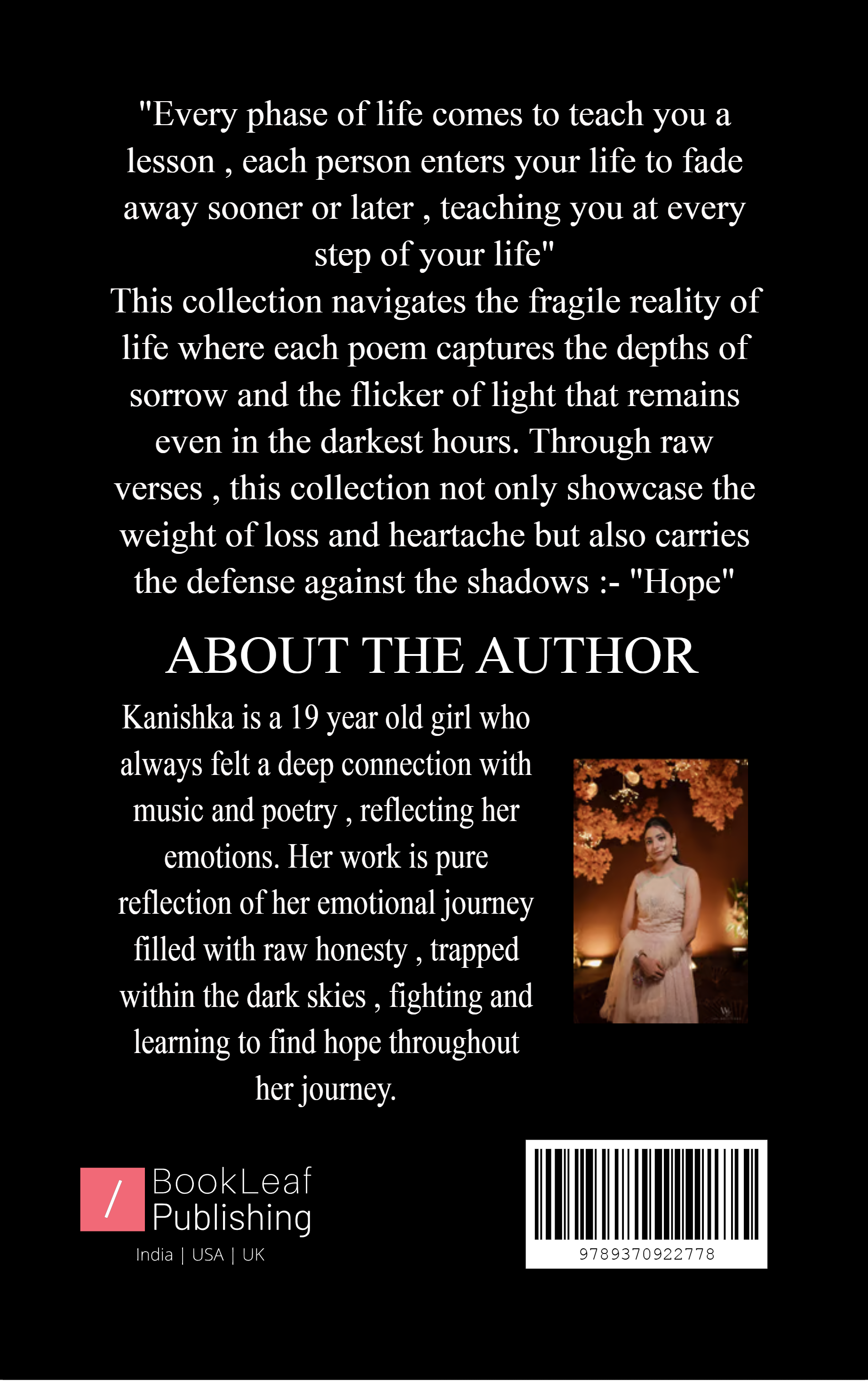 "Every phase of life comes to teach you a lesson , each person enters your life to fade away sooner or later , teaching you at every step of your life" This collection navigates the fragile reality of life where each poem captures the depths of sorrow and the flicker of light that remains even in the darkest hours. Through raw verses , this collection not only showcase the weight of loss and heartache but also carries the defense against the shadows :- "Hope"