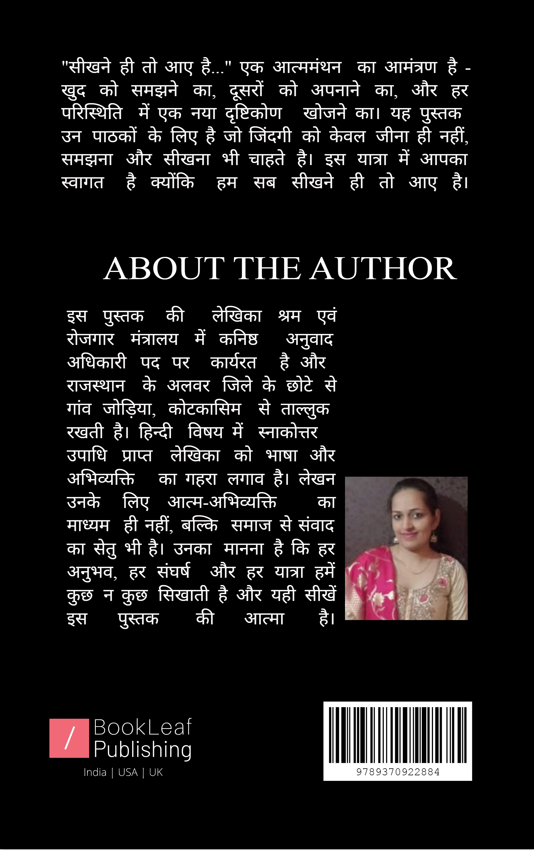 "सीखने ही तो आए है..." एक प्रेरणादायक पुस्तक है जो जीवन में आने वाले अनुभवों को सीखने के अवसर के रूप में देखने की दृष्टि देती है। हर परिस्थिति, हर व्यक्ति हमें कुछ न कुछ सिखाने आता है। यह पुस्तक आत्म-विकास, सकारात्मक सोच और जीवन को समझने का एक सुंदर माध्यम है।