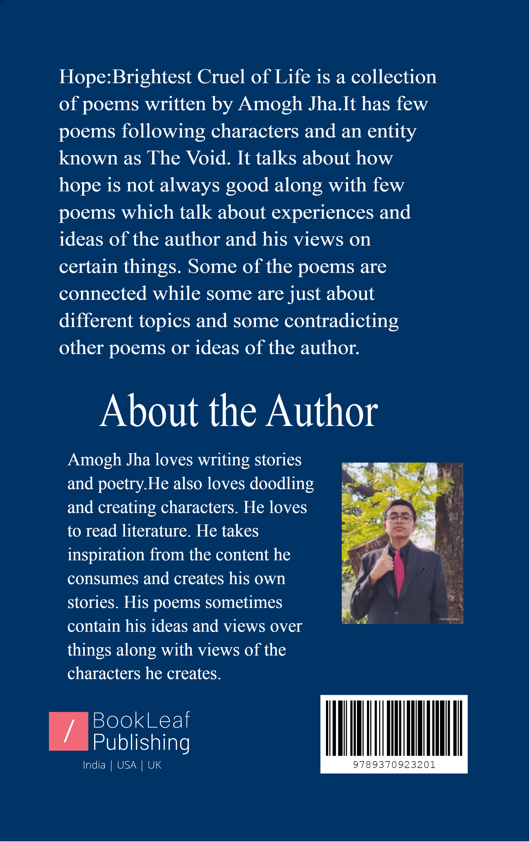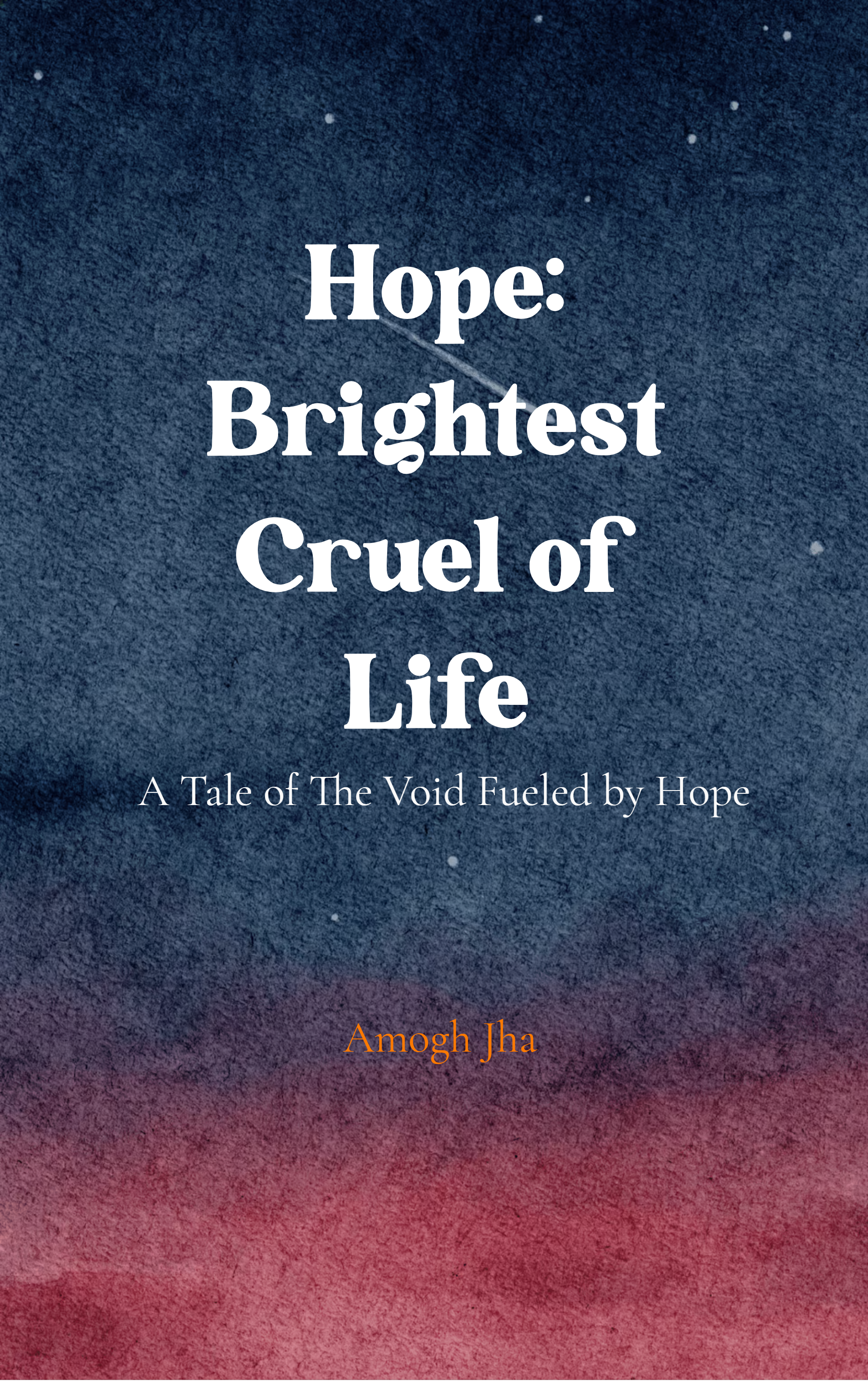 Hope: Brightest Cruel of Life is a collection of poems written by Amogh Jha.It has few poems following characters and an entity known as The Void. It talks about how hope is not always good along with few poems which talk about experiences and ideas of the author and his views on certain things. Some of the poems are connected while some are just about different topics and some contradicting other poems or ideas of the author. It is the first time the author took his writing seriously and wrote this book of poems.