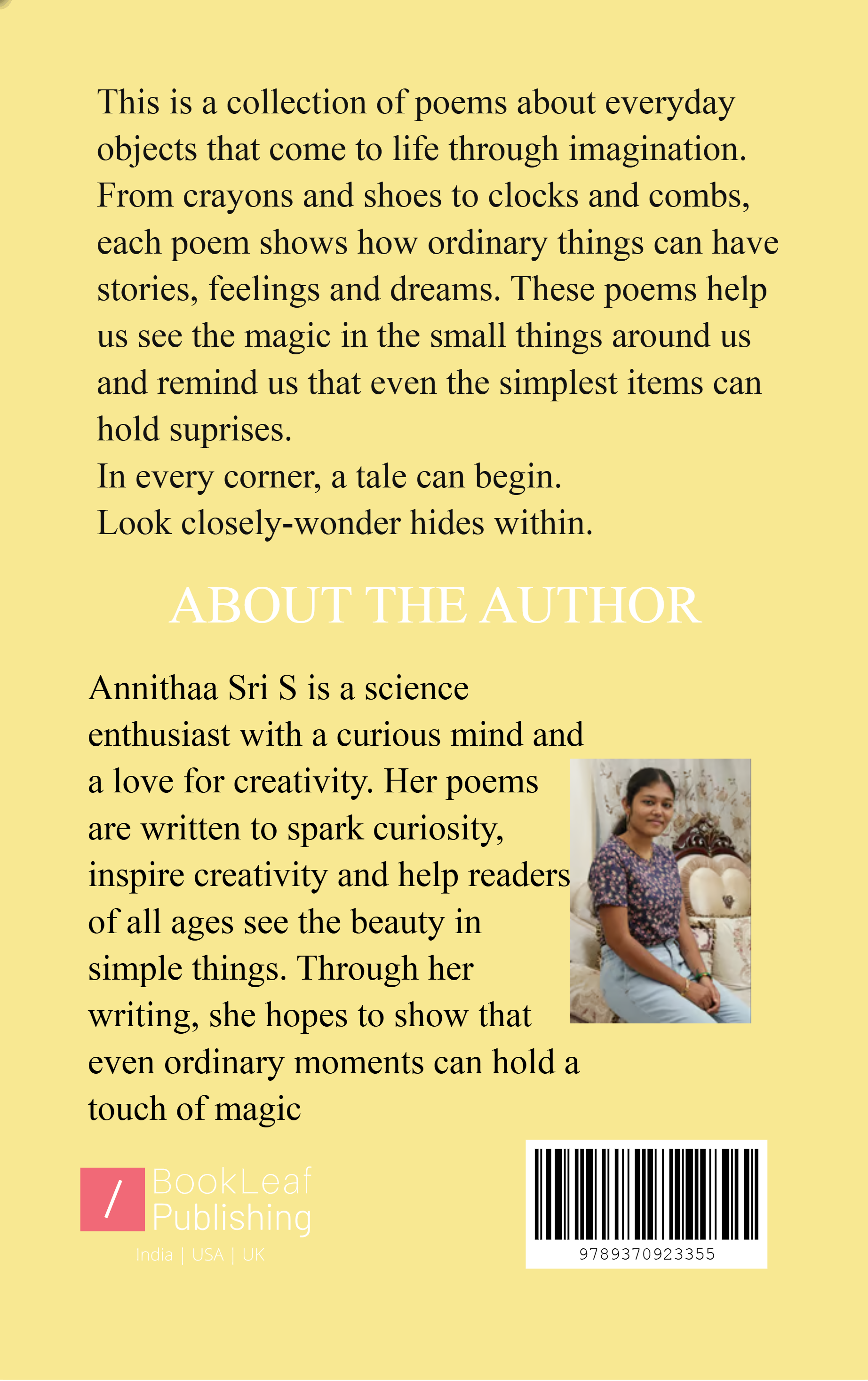 Echoes in Ordinary Things is a charming collection of poems that brings everyday objects to life through imagination. With warmth and creativity, each poem reveals the hidden stories and quiet wonders in items like crayons, shoes, clocks, and combs—reminding readers that magic can be found in the simplest things around us.