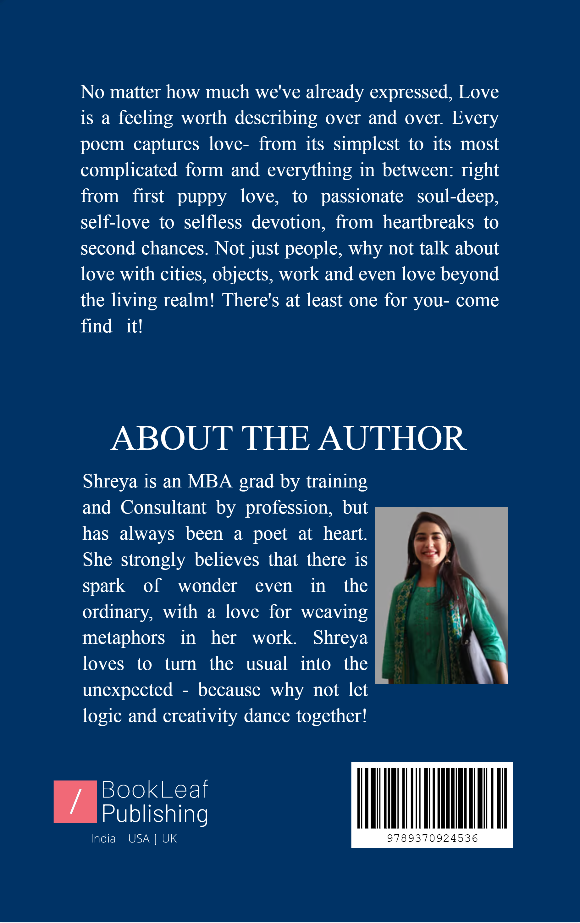 No matter how much we've already expressed, Love is a feeling worth describing over and over. Every poem captures love- from its simplest to its most complicated form and everything in between: right from first puppy love, to passionate soul-deep, self-love to selfless devotion, from heartbreaks to second chances. Not just people, why not talk about love with cities, objects, work and even love beyond the living realm! There's at least one for you- come find it!