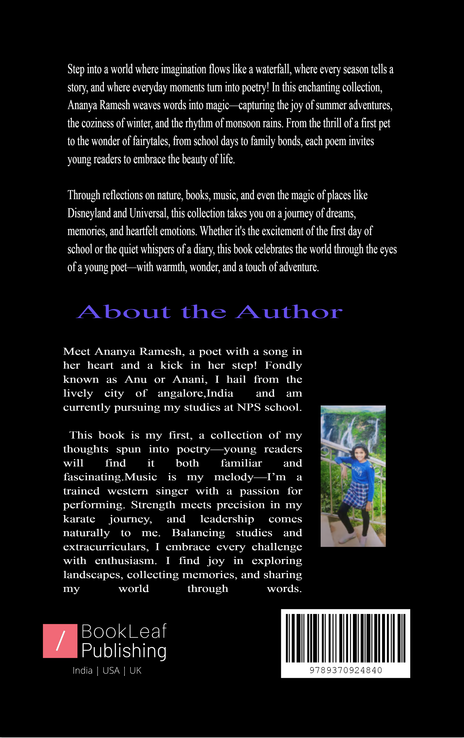 This poetry collection by Ananya Ramesh presents a vivid exploration of the world through the eyes of a young writer. Covering a diverse range of themes—including nature, seasons, school experiences, cherished family moments, and the magic of books and music—each poem captures the essence of everyday life with depth and imagination.