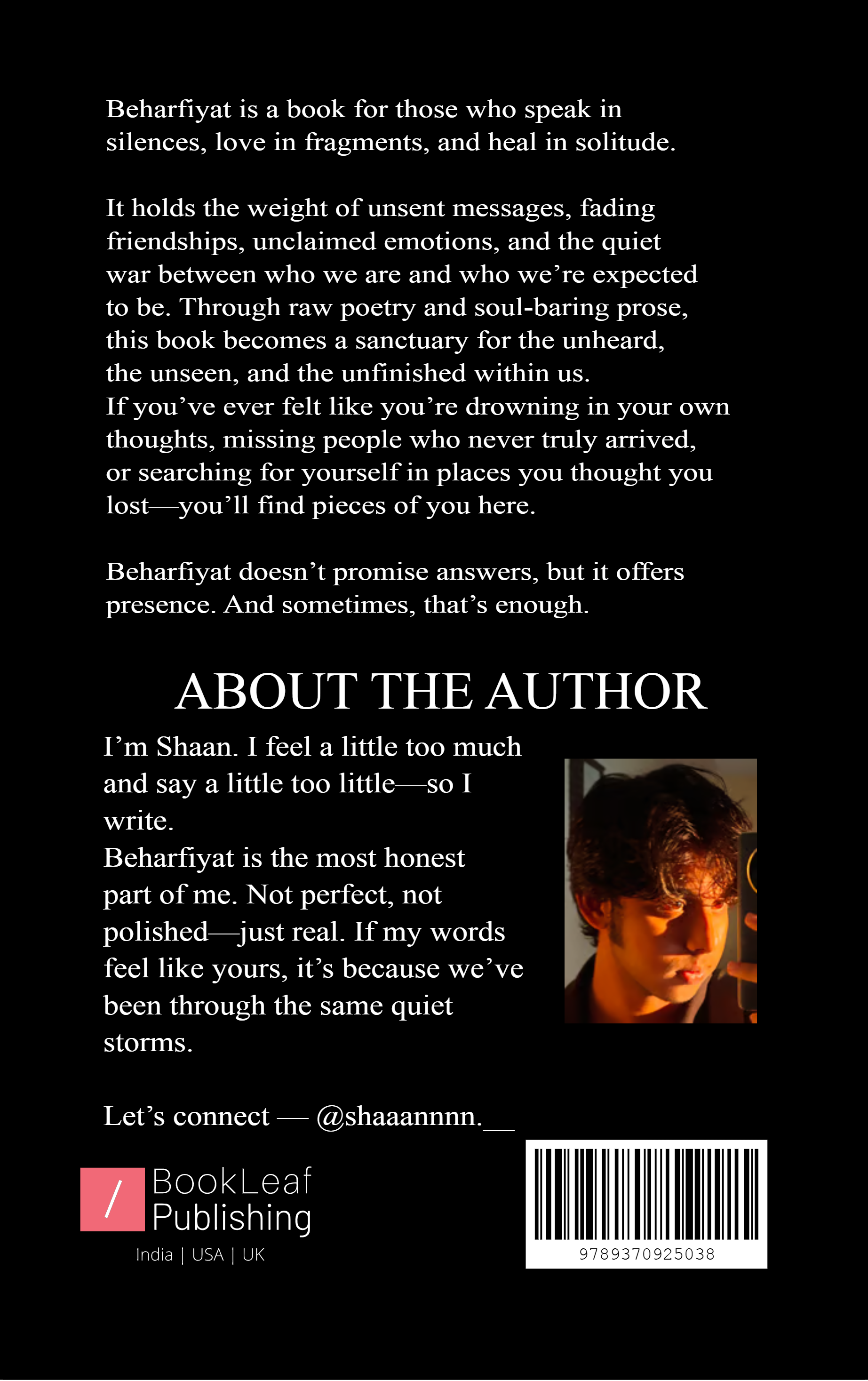 Beharfiyat is a journey into the quiet spaces between words—where emotions breathe without explanation. Blending poetry and prose, it explores love, loss, silence, and self-connection through a raw and intimate lens. Each piece is a fragment of feeling, written not to impress but to express. For those who’ve felt deeply yet struggled to speak, Beharfiyat offers a home in its wordlessness—a mirror for the soul and a companion for the heart.