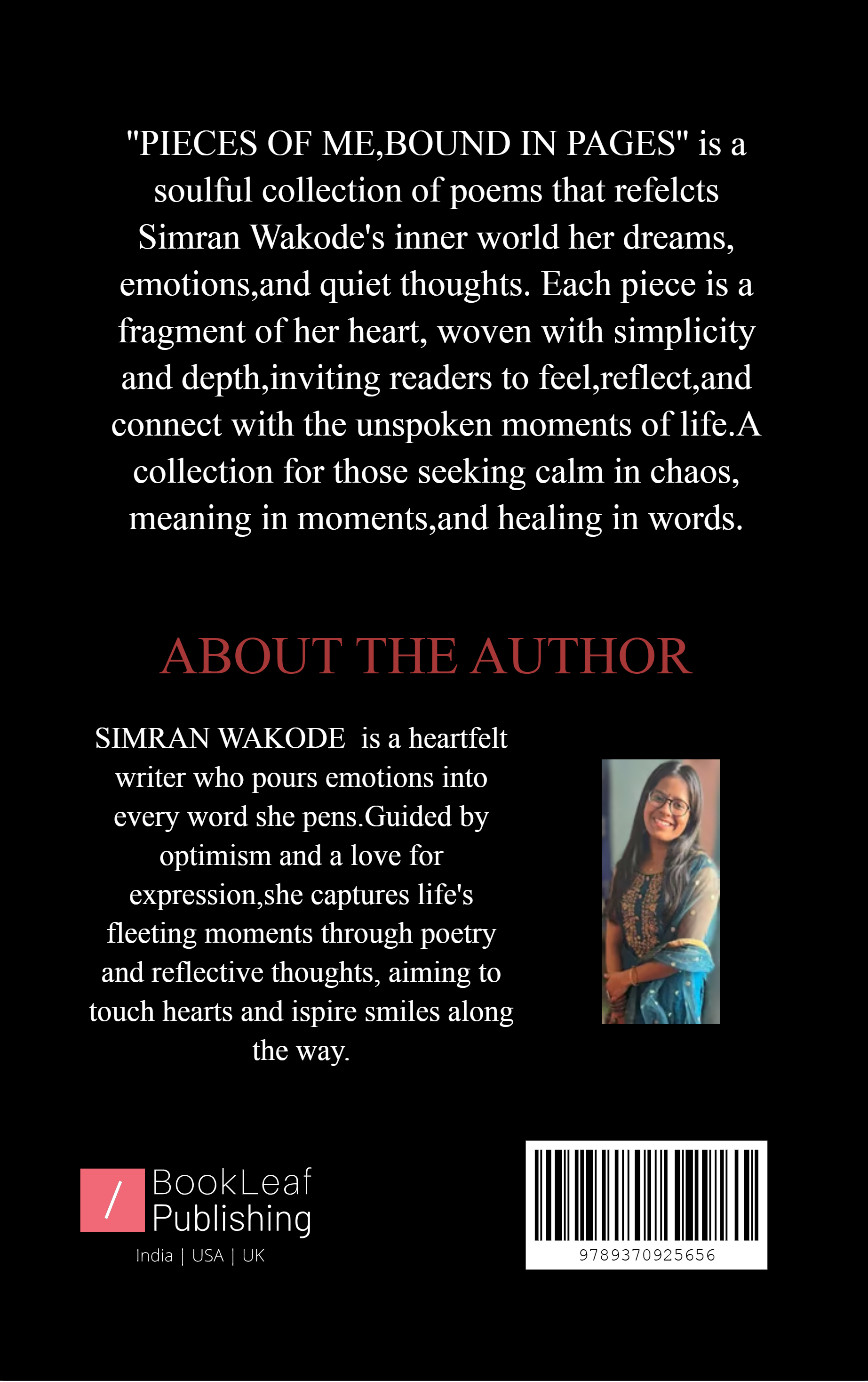 ''PIECES OF ME, BOUND IN PAGES'' is a heartfelt journey through the fragments of life moments of love, loss, growth, and reflection brought to life through poetry and prose. Simran Wakode’ s words offer a window into the depth of emotions, embracing both the light and the shadows. Each page invites readers to pause and connect with the subtle beauty of everyday life, finding solace and strength in its quiet corners. This collection celebrates the delicate balance between vulnerability and resilience, and the healing power of words"