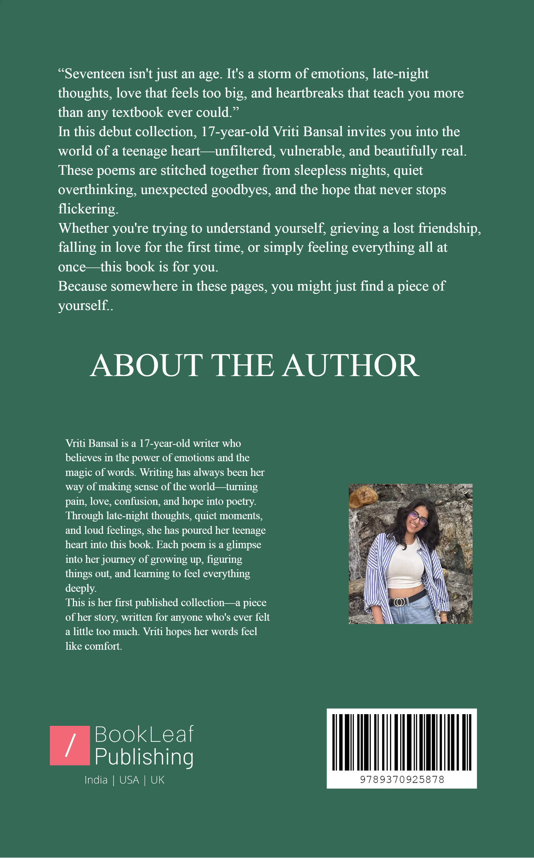 Being 17, emotions are vivid, love is boundless, and the process of maturing is both exciting and troubling. It is at this age that Vriti Bansal, in her debut poetry collection, pours out her heart by capturing the bittersweet, truthful moments of teenagehood. Through the pages of this collection, she gives a voice to many unsaid songs through poems on friendship, heartbreak, self-doubt, dreams, introspection, and healing. This book is for anyone who felt too much, stayed awake all night overthinking, or simply wished that someone understood.
