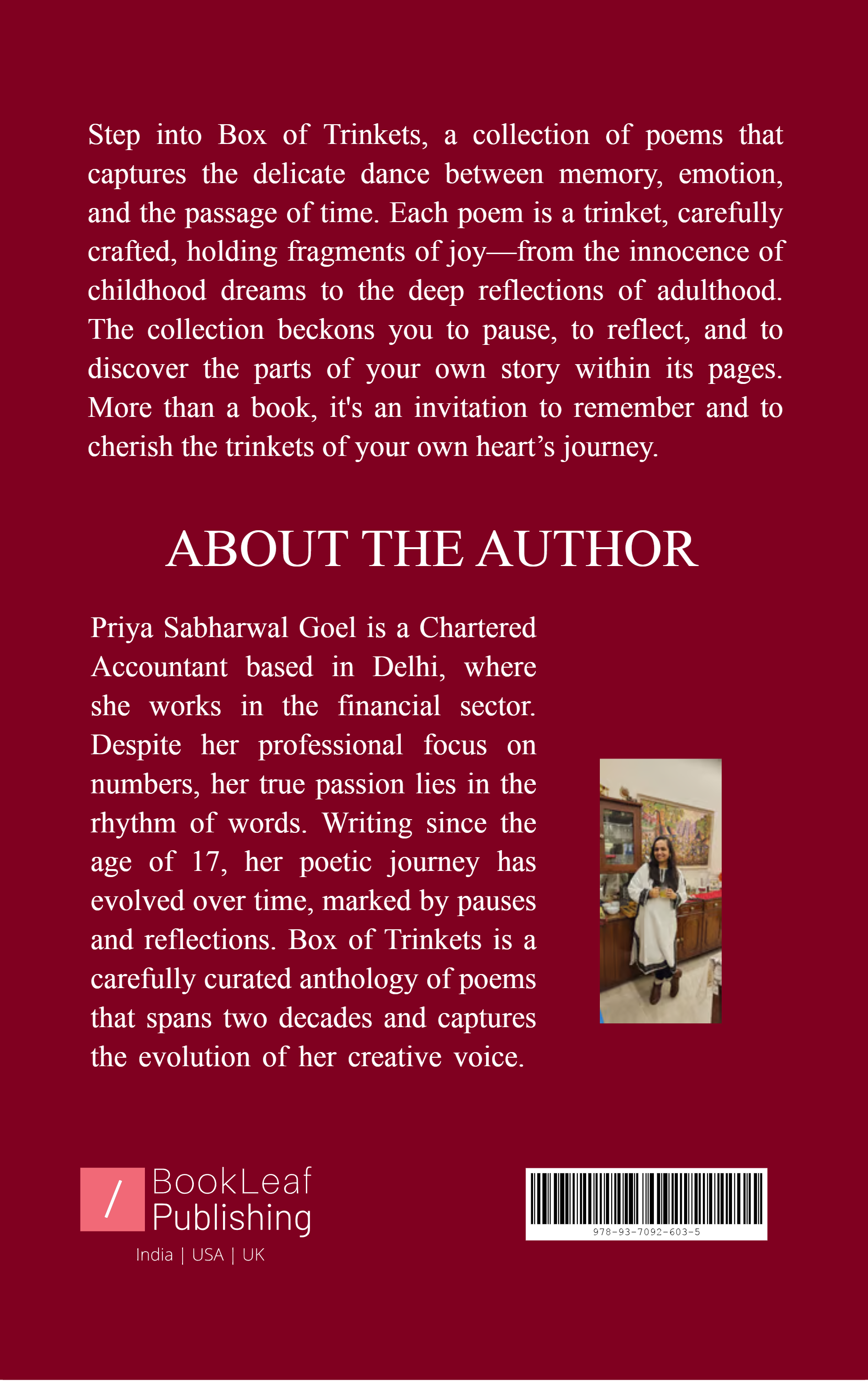 Box of Trinkets is a collection of poems that spans two decades, capturing the evolution of the author’s creative voice. Each poem, like a trinket, holds fragments of joy, longing, love, and reflection. From the innocence of childhood dreams to the complexities of adulthood, the poems explore themes of self-discovery, nature, relationships, and the passage of time. This anthology invites readers to pause, reflect, and find their own stories within its pages. A journey through memory and emotion, Box of Trinkets is for anyone who has felt the connections that shape us.