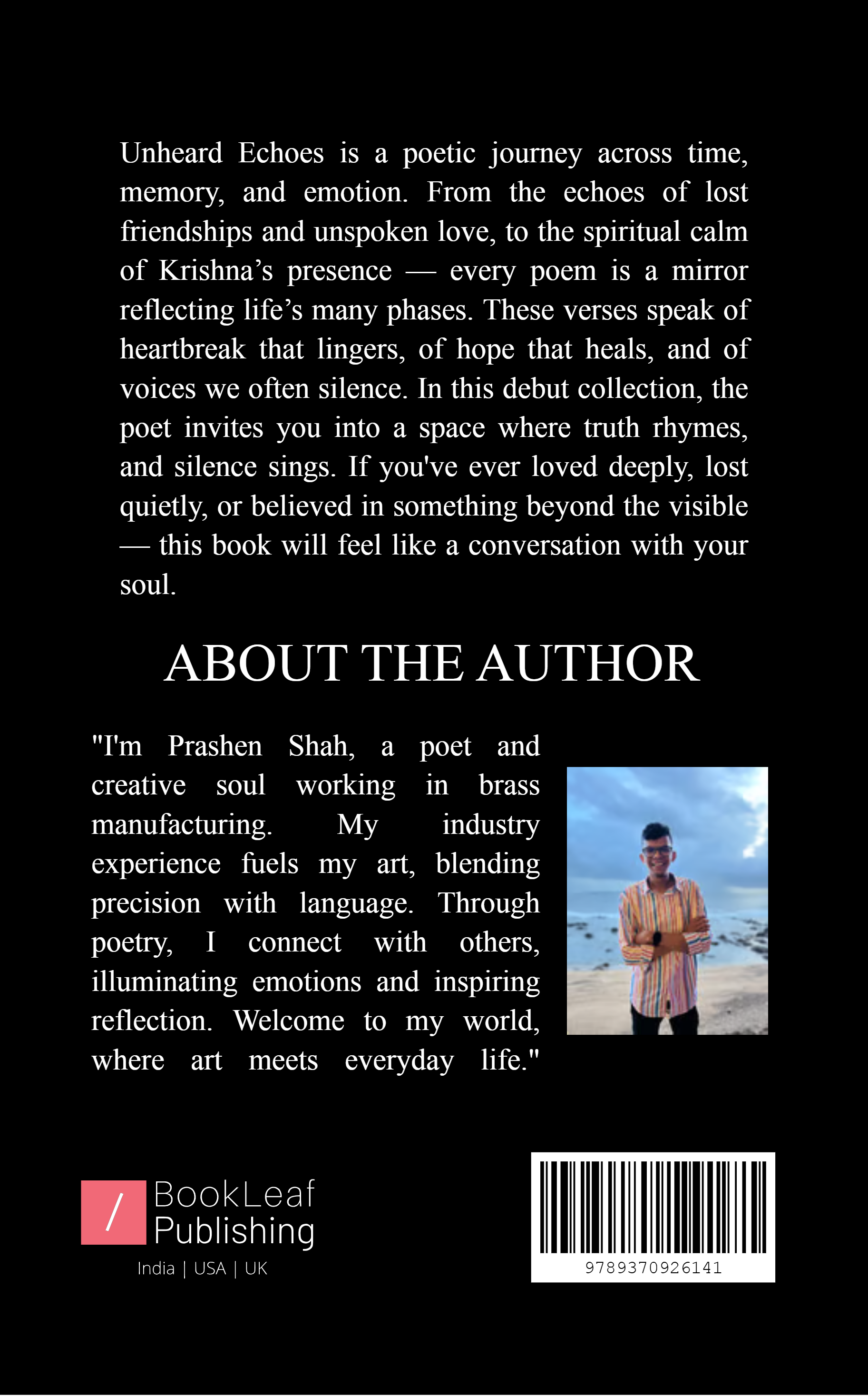 “Unheard Echoes” is a heartfelt collection of poems tracing the quiet moments, forgotten feelings, and unsaid words we carry through life. From childhood memories to silent heartbreaks, each verse is a reflection of love, loss, hope, and healing. Written with raw emotion and deep introspection, this book invites readers to pause, reflect, and feel seen in the echoes of their own untold stories.