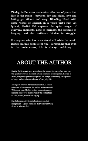 Zindagi in Between is a heartfelt collection of Hindi poems that captures life in its quietest, most tender moments. Through verses shaped by silence, longing, and hope, Shalini Pal explores the spaces between pain and healing, light and shadow, beginnings and farewells. Each poem invites the reader to pause and reflect — on memories, emotions, and the beauty of what often goes unnoticed. Rooted in simplicity yet rich in feeling, this debut collection is not just poetry, but a journey into the unspoken. For anyone who has lived in the in-between, these poems will feel like home.