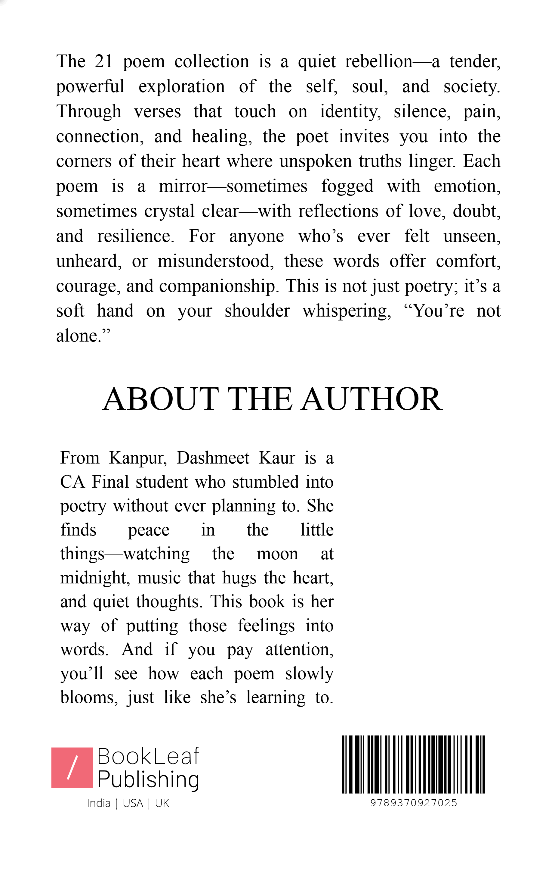 The 21 poem collection is a quiet rebellion—a tender, powerful exploration of the self, soul, and society. Through verses that touch on identity, silence, pain, connection, and healing, the poet invites you into the corners of their heart where unspoken truths linger. Each poem is a mirror—sometimes fogged with emotion, sometimes crystal clear—with reflections of love, doubt, and resilience. For anyone who’s ever felt unseen, unheard, or misunderstood, these words offer comfort, courage, and companionship. This is not just poetry; it’s a soft hand on your shoulder whispering, “You’re not alone.”