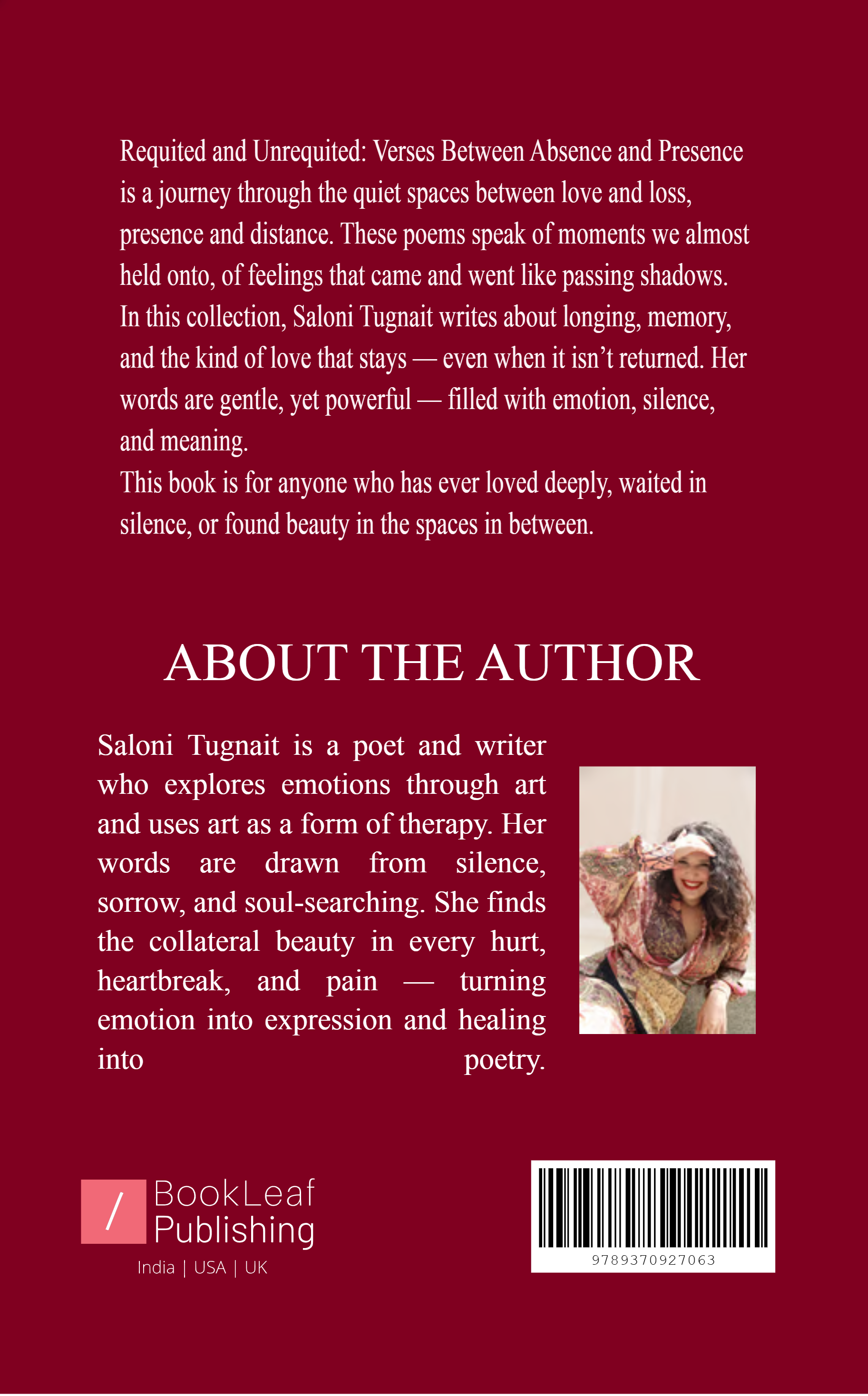 This book is a journey through love that stays and love that fades. Between presence and absence, these verses explore the quite ache of longing and the healing we find in little things. From romantic love to the tender bonds we share with our parents, siblings, friends, pets, and even our inner selves. This book is a raw collection of every shade of love experience in a lifetime. It reveals the collateral beauty hidden in heartbreak, hope, and human connection.