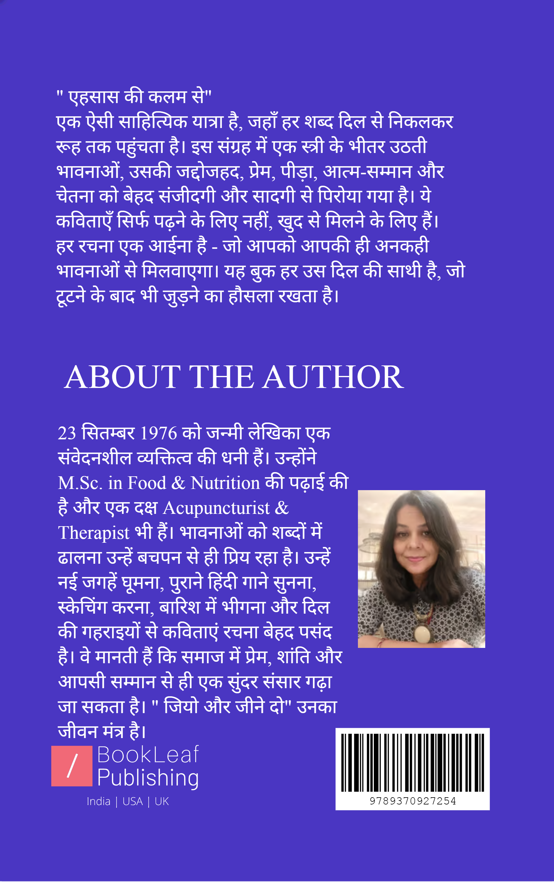 यह "एहसास की कलम से' केवल कविताओं का संग्रह नहीं, एक स्त्री के अंतर्मन की यात्रा है - उसकी संवेदनाओं, संघर्षों, प्रेम, पीड़ा और आत्मबोध की दास्तान | हर पंक्ति में एक हृदय की सच्ची धड़कन है, जो पाठकों को भीतर तक छू जाती है। ये कविताएं न सिर्फ भावनाओं को शब्द देती हैं, बल्कि आत्म-स्वीकृति, साहस, आत्मबल और सकारात्मक सोच का संदेश भी देती हैं। यह संग्रह हर उस दिल की आवाज़ है, जिसने कभी खुद को खोया और फिर नए विश्वास से जीना सीखा। यह किताब महसूस करने के लिए है- पढ़ने के लिए नहीं।